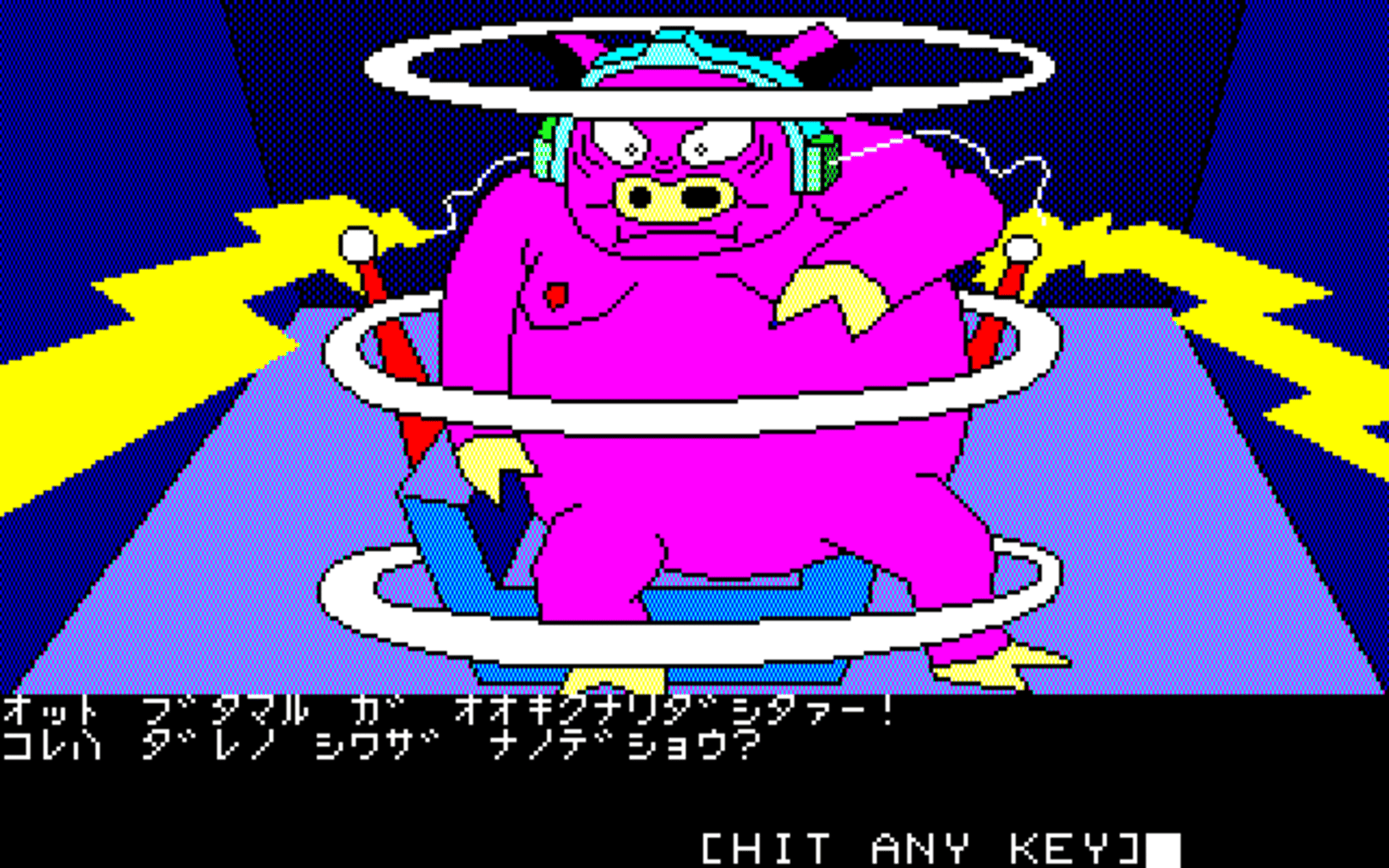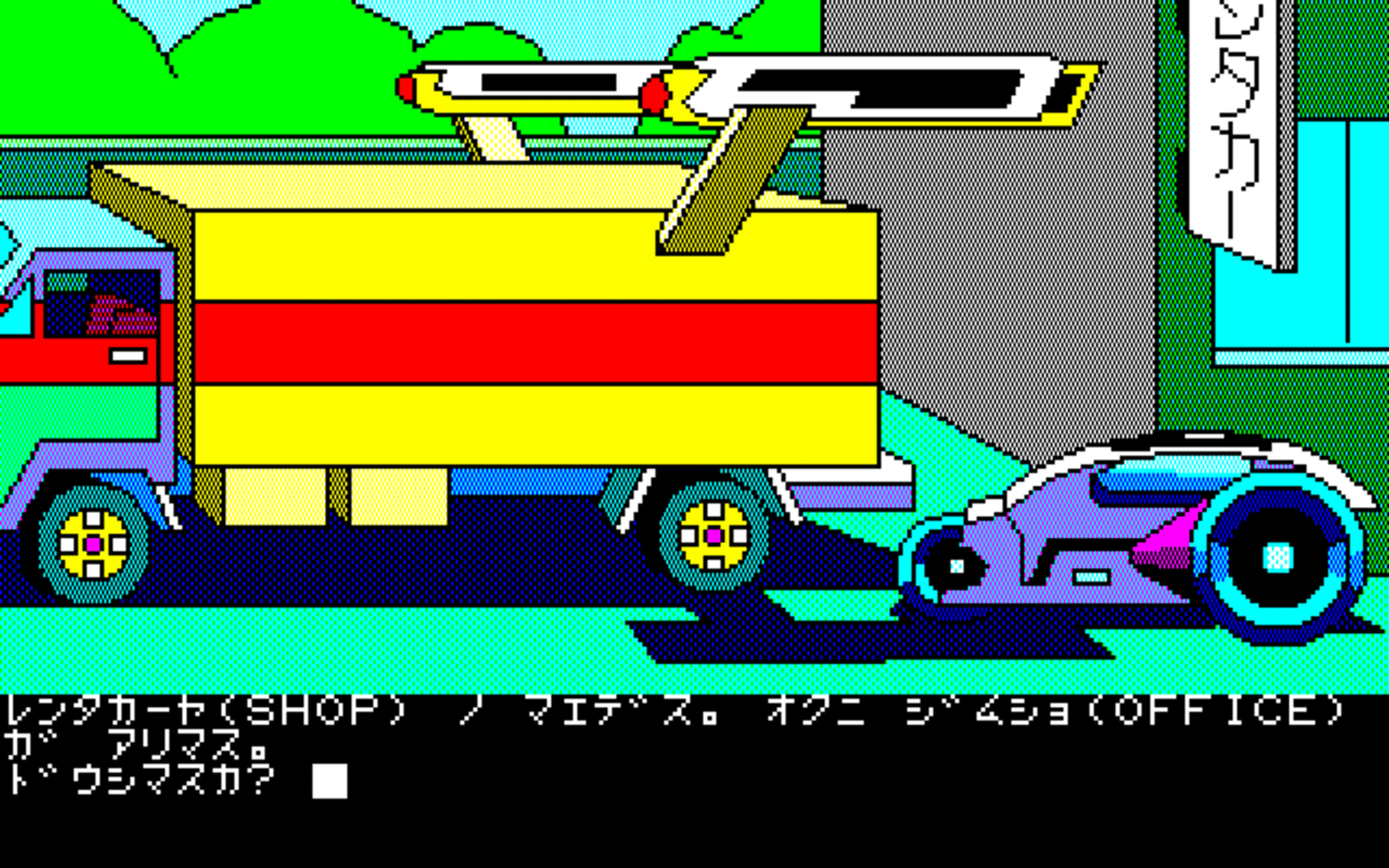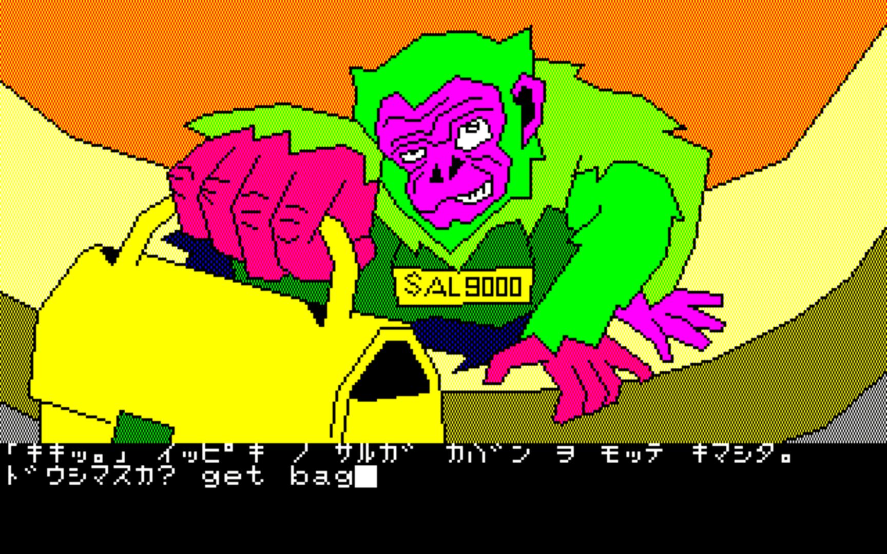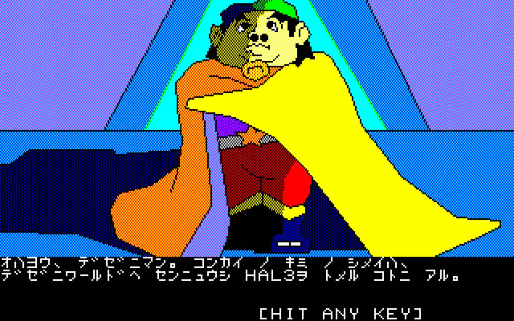 Dezeni World is a sequel to Dezeni Land. Like its predecessor, it is set in a theme park, this time with a broader range of parodies. Gameplay-wise, it is very similar to the previous title. The player moves from screen to screen with key abbreviations representing the four directions, and interacts with the environment by typing combinations of verbs and nouns. The game is fairly simple and develops in a comparatively linear fashion, with only a few items needed to access the next area, and puzzles mostly involving talking to people or using the right item at the right place.