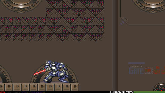 Iron Blood is an arcade-style action game where the player controls one of two mechs, fighting against the criminal organisation Memento Mori. Piloting the heavily-armored RG-104 Cyber-Troll or the nimble SG-43 Ripple, the game varies between side-scrolling action and auto-scrolling shoot'em up stages.