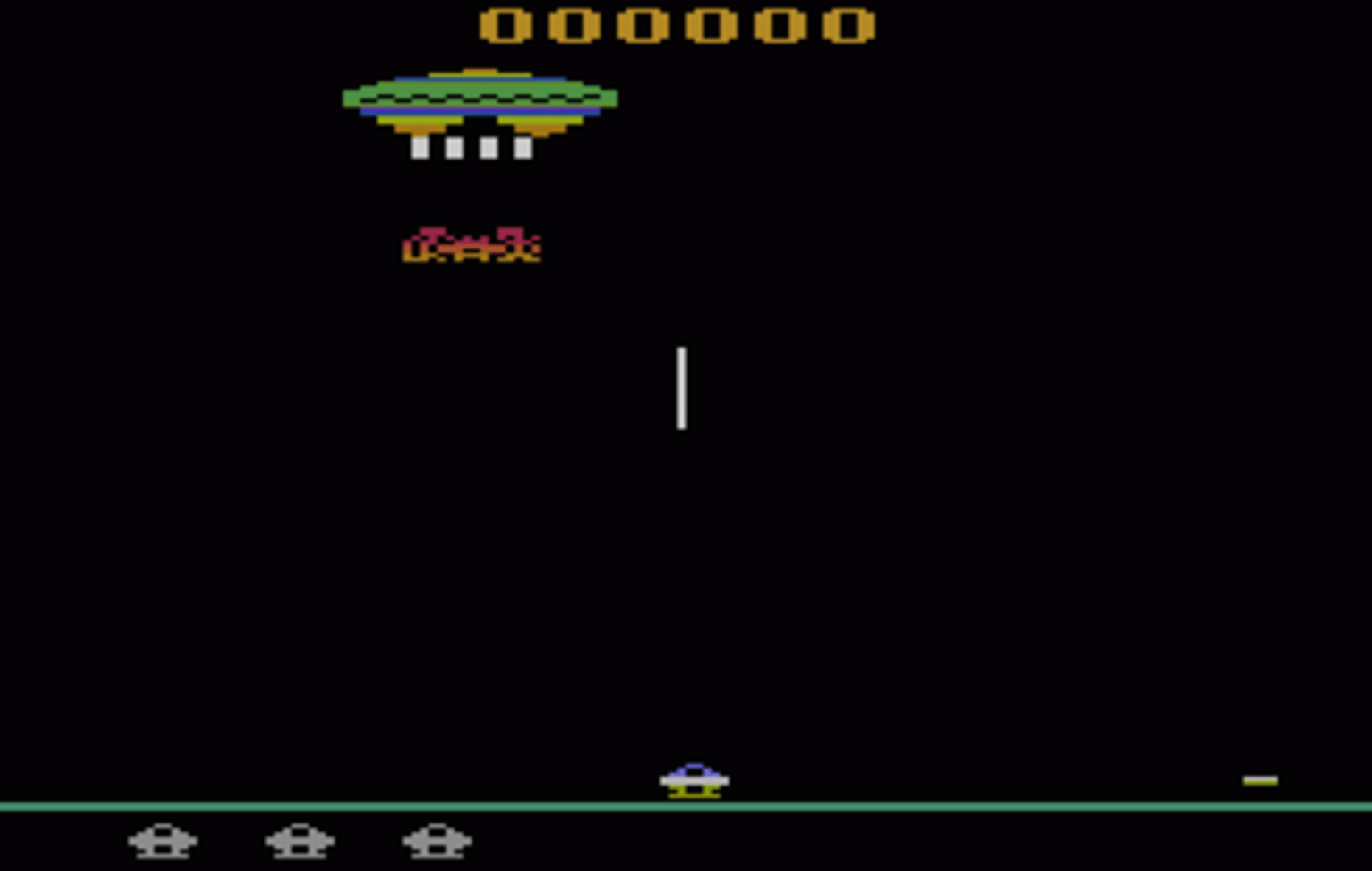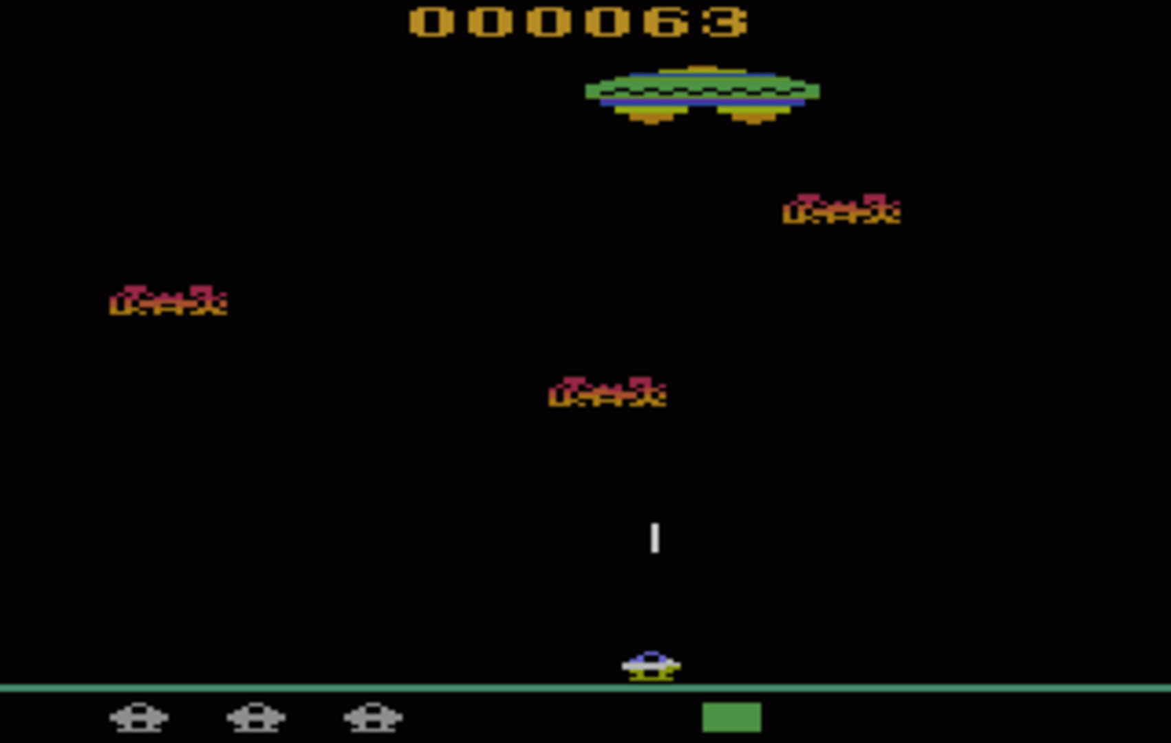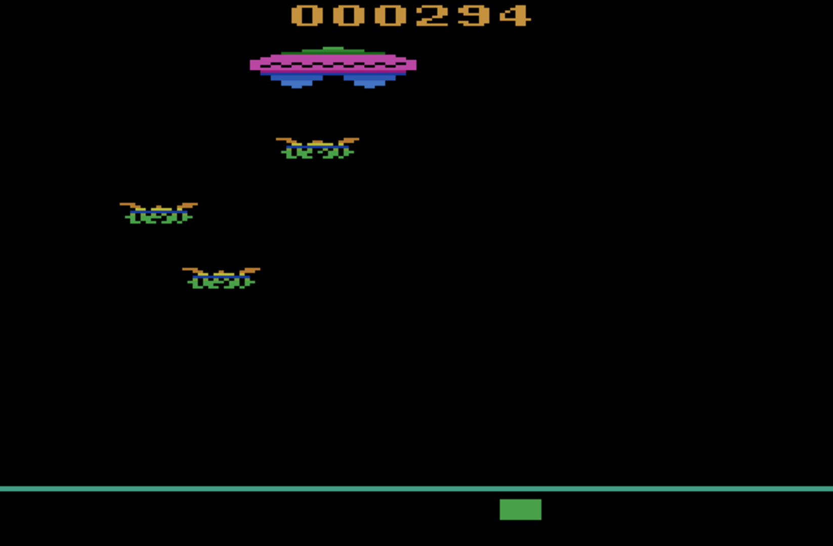 A mothership drops aliens, up to three on screen at a time. There are ten per level. You must shoot them but avoid the items they fire at you. You fire by pushing up on the joystick. Pushing left or right makes you go left or right. If you hold down the button, pushing left or right makes you fire left or right. Later enemies will drop fireballs that chase you along the ground or split in two smaller enemies when shot. If you fire non-stop, you will build up heat as indicated by the green bar at the bottom right. If you overheat or are hit by an enemy, you loser a life. The game is over when you lose all lives or reach a score of 999,999. You get a new man (4 max) every 10,000 points.