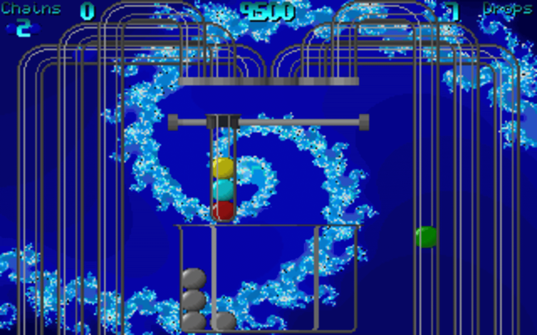 Tubes is a shareware color matching puzzle game. The main screen shows a series of overlapping transparent tubes climbing from the bottom and curving at the top towards the center. Colored balls, or elements as the game calls them, travel through these tubes to their exit holes. The objective is to catch the falling spheres with a test tube, moving it sideways underneath the tubes exits with the mouse, keyboard or joystick. The test tube can hold up to five elements. The player has to press a button and drop the elements inside a beaker at the bottom, aligning them vertically, horizontally or diagonally by three or more of the same color. Every level has a number of drops allowed, and when the player fails to catch too many elements the game is over. Besides the elements, special balls also appear randomly inside the tubes that help or hinder the player. The multicolored element acts as a wildcard, and can be matched with any color. The F element removes space inside the test tube. The M element fills the test tube with assorted balls. The C element creates a gray ball that can't be matched. The game comes with two modes. In endurance mode, the goal is to make as many points as possible, by making matches until all the allowed drops are spent. In wave mode, each level (or "wave") has objectives, like making a specific type of match, that must be completed before finishing and moving to the next one.