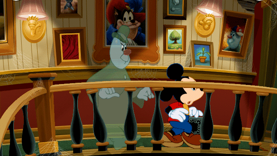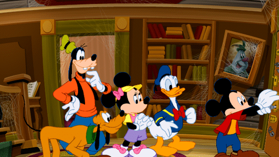 It's a dark and stormy night when Mickey and friends drop in at a haunted house looking for directions; the front door slams shut, locking the group in, and the five of them spread out to search the house for keys. The house is haunted by three friendly ghosts that only Pluto and the player can see; Shaky, Quaky and Clyde, who assist the group by making keys available as Mickey and pals solve six puzzles. Silverware dances, a stuffed bear yawns and stretches, spiders scurry about as the player clicks on items in the six rooms; often two characters will converge in a room and hold a short conversation while the player is idle. Gameplay uses the mouse; to move from room to room the player clicks where the cursor becomes an arrow - at the edge of the screen, on the staircase and the secret passageway.