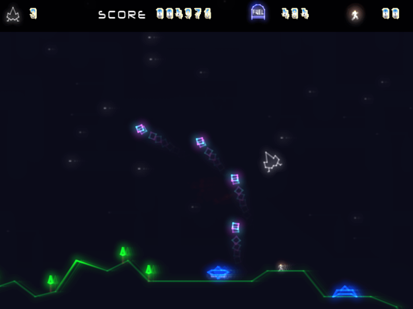 GraviTron is a side-scrolling game in the style of Thrust and Lunar Lander. The objective is to navigate a spaceship over different planets, and destroy the reactors located there. The spaceship can rotate clockwise and counterclockwise as well as thrust forward, to avoid the pulling force of gravity. The spaceship can also fire lasers straight ahead and wrap itself in a protective shield which also deflects enemy fire. Points are awarded for the number of enemies destroyed, with higher scores given for using the shield deflection. Additionally, each planet has a number of spacemen walking the surface who can be rescued for extra points. In order to make the rescue, the player simply has to land carefully on a flat, even surface near the spacemen. Also featured is a multiplayer deathmatch mode and a level editor for designing one's own planets.