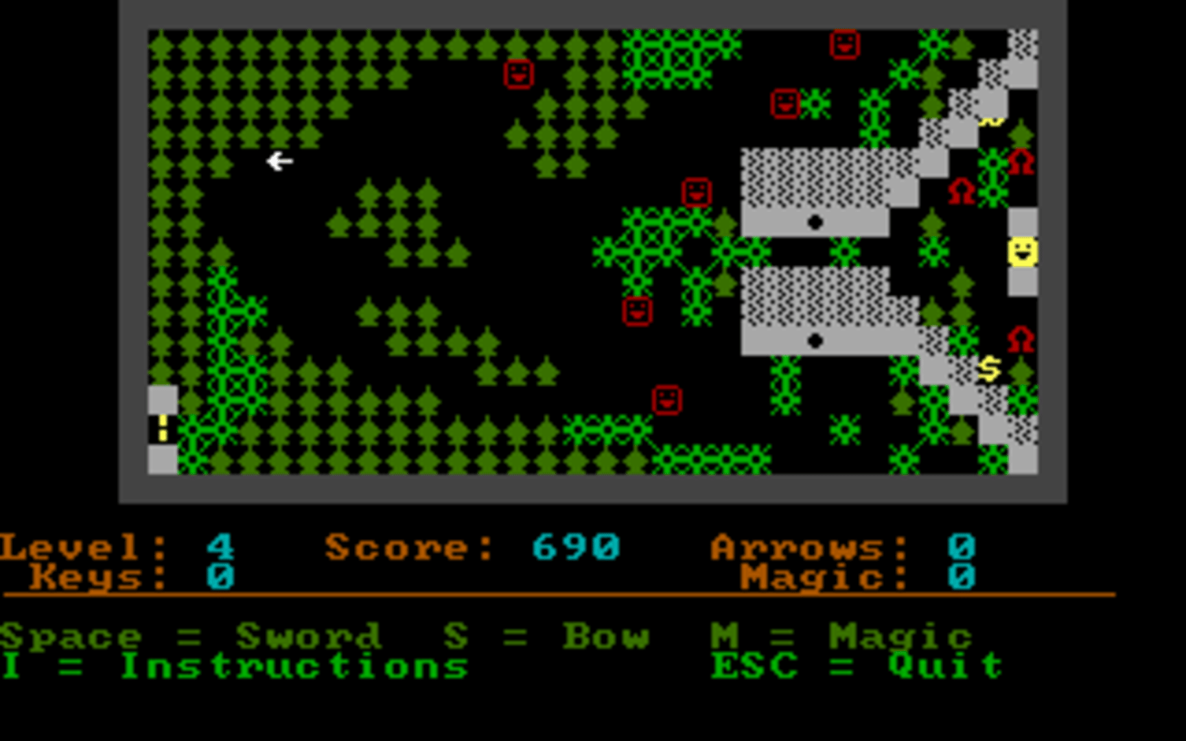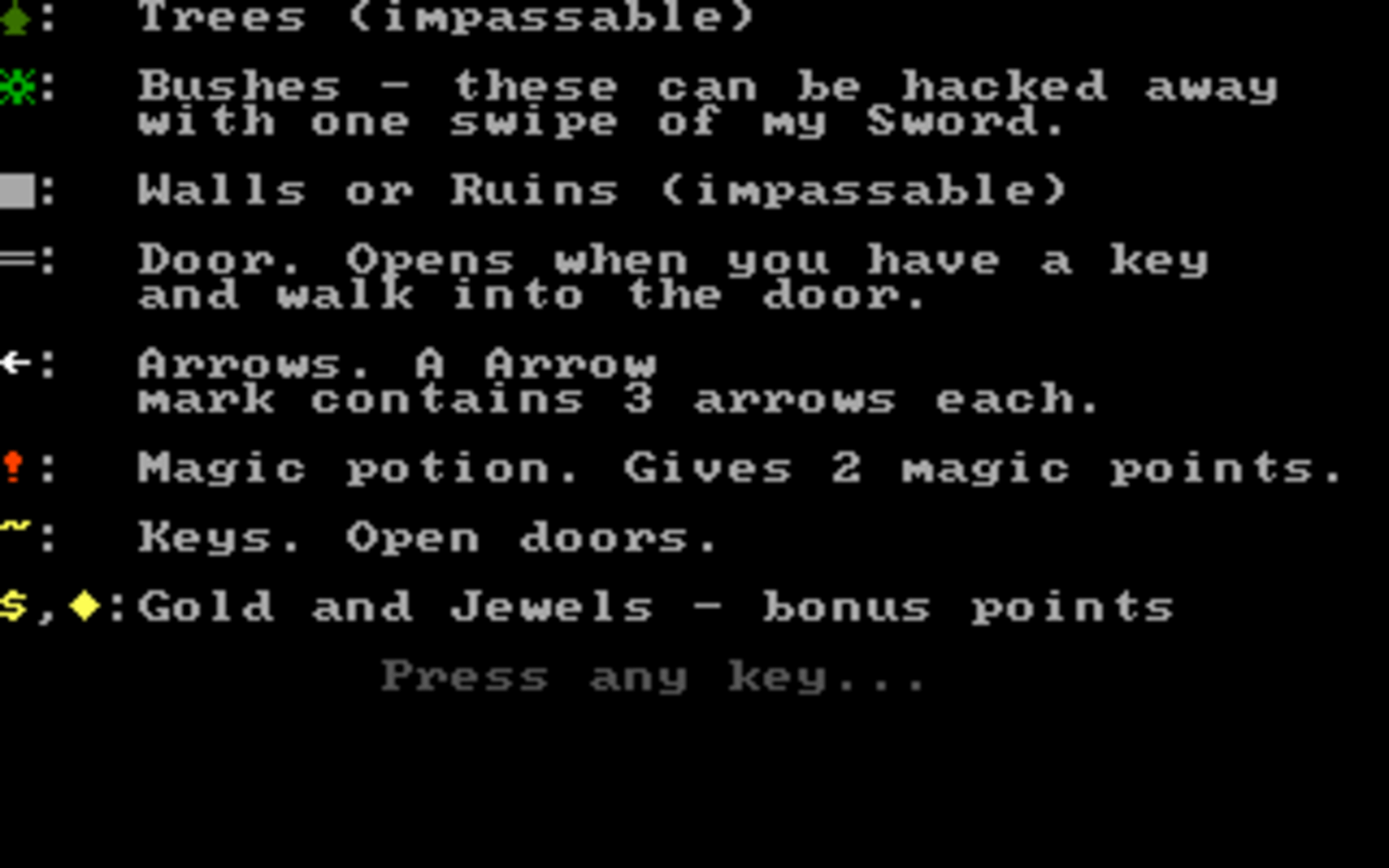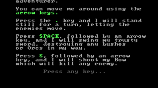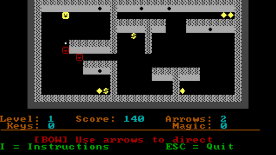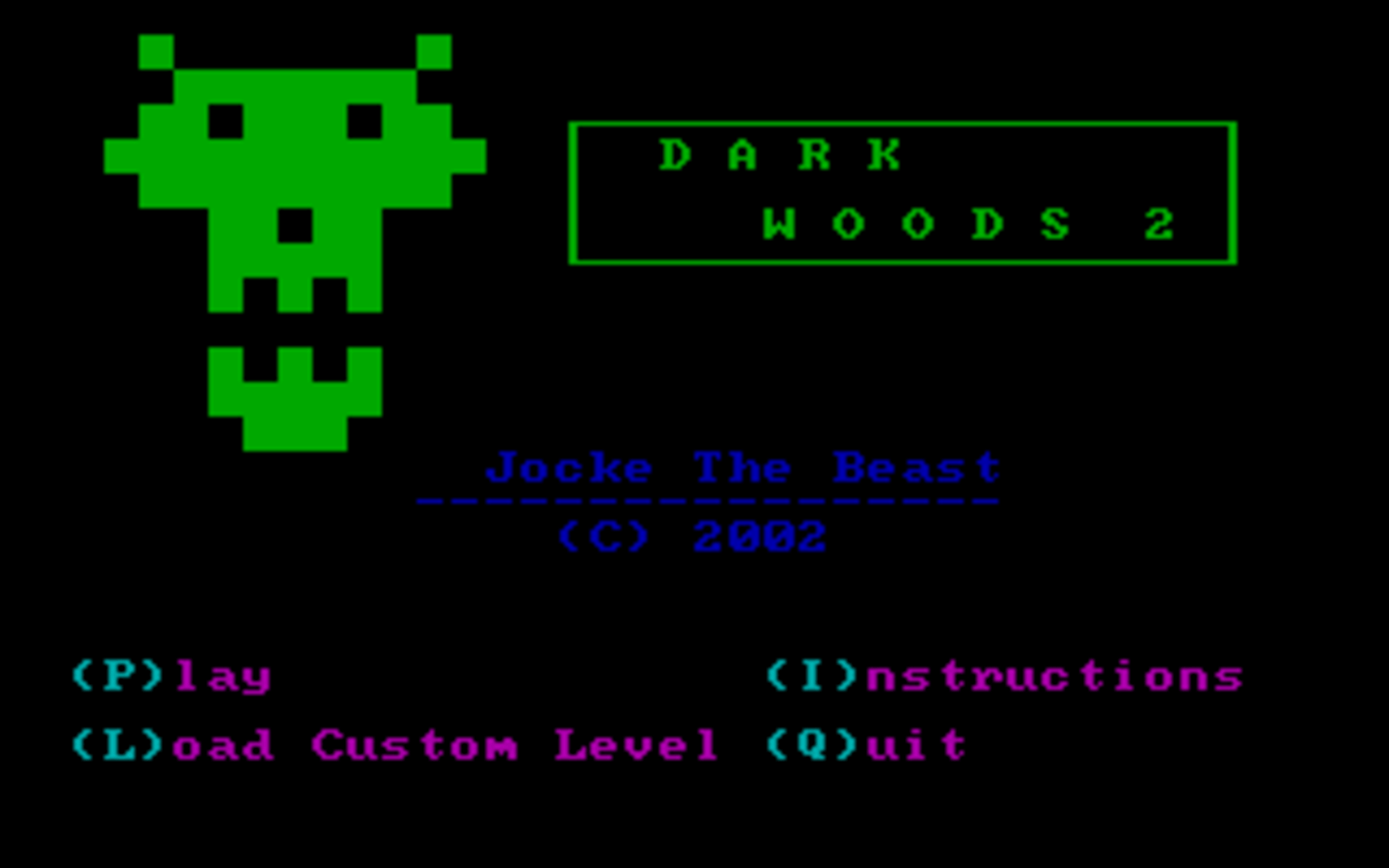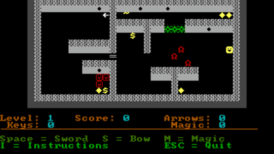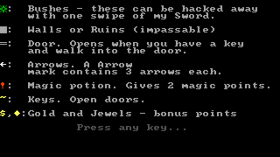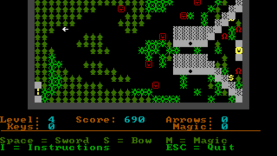 Dark Woods 2 is a top-down adventure game with graphics made entirely out of ASCII characters. The game world is divided into levels, which contain items that are needed to complete them, and enemies that have to be avoided or outsmarted. The game features 11 levels and the option to make/play custom levels.