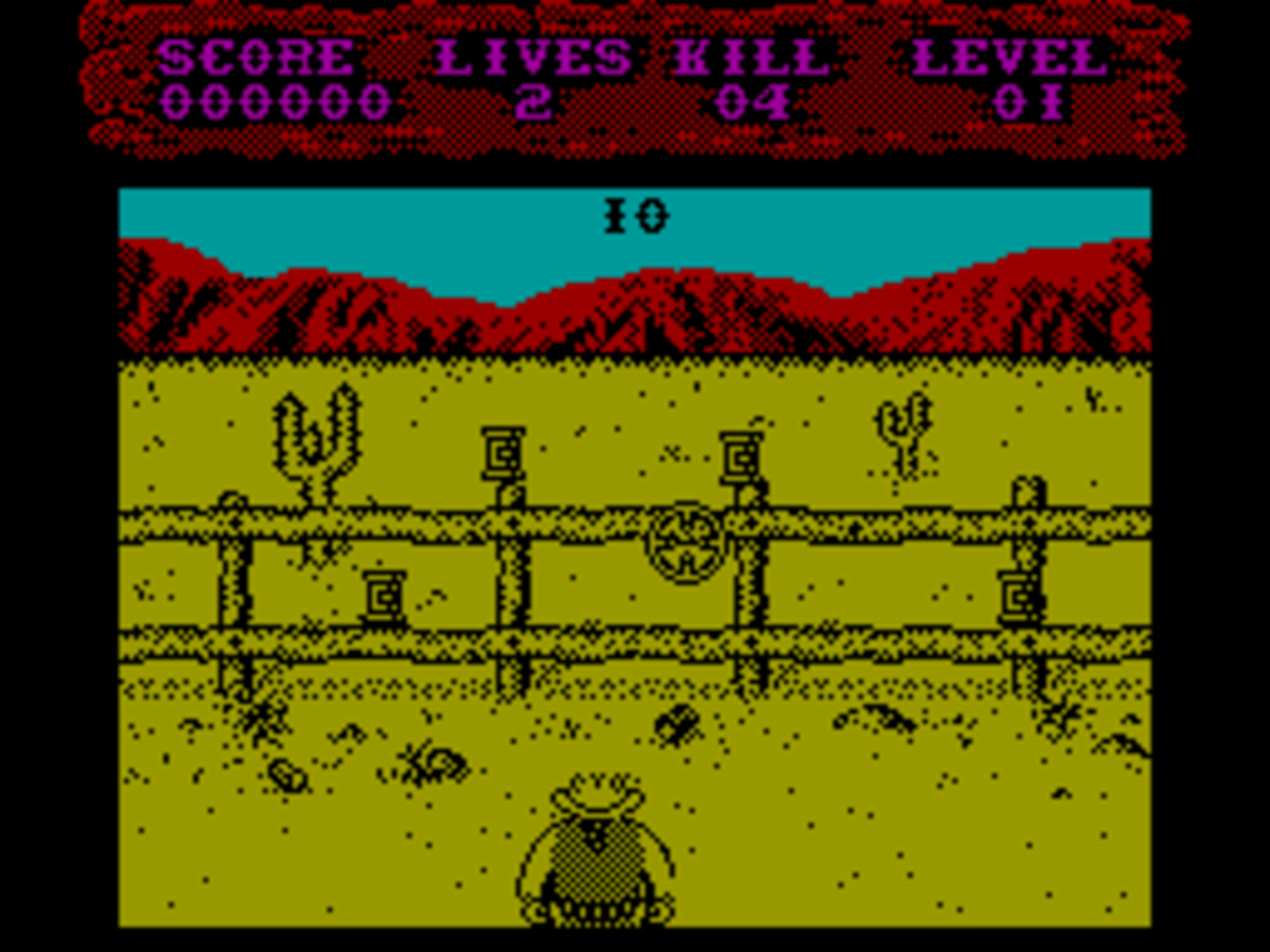 Shoot-out is a traditional arcade western shooter and it takes place in the desert landscape of Gulch Creek. Each level is composed by two distinct scenarios. The player will play as Quick Hand Luke.
