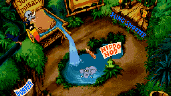 Timon and Pumbaa's Jungle Games consists of five mini-games featuring Timon and Pumbaa, as well as other jungle animals from The Lion King. The games are as follows: Jungle Pinball – a pinball game where the board is filled with animals instead of bumpers. Burper – a shooter type game, using Pumbaa to belch gas. Hippo Hop – concept similar to Frogger, as well as a game where Timon tries jumping across the river without falling in. Bug Drop – based on Puyo Puyo. Slingshooter – a slingshot game using berries to hit certain objects such as animals, cardboard targets, and bugs not counting Timon and Pumbaa as targets.