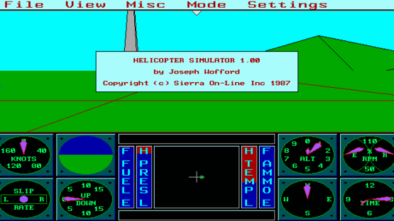 In 3-D Helicopter Simulator, fly the McDonnell Douglas AH-64A Apache attack helicopter. The game allows the player to fly over various locations, or play in a target practice and combat modes. Two players can compete via a modem.