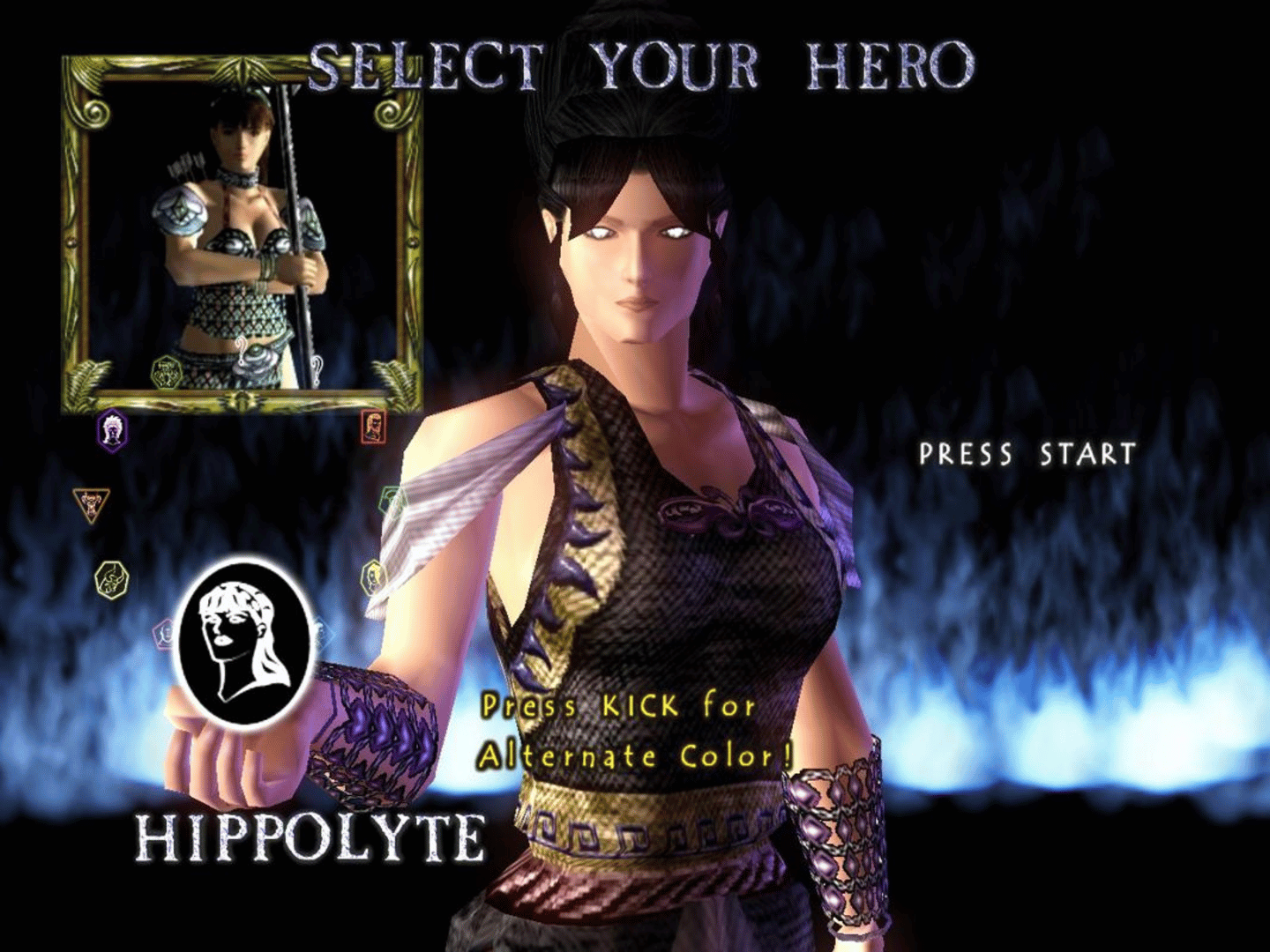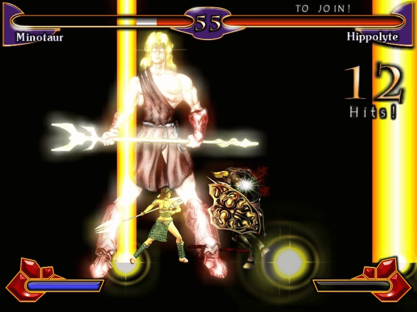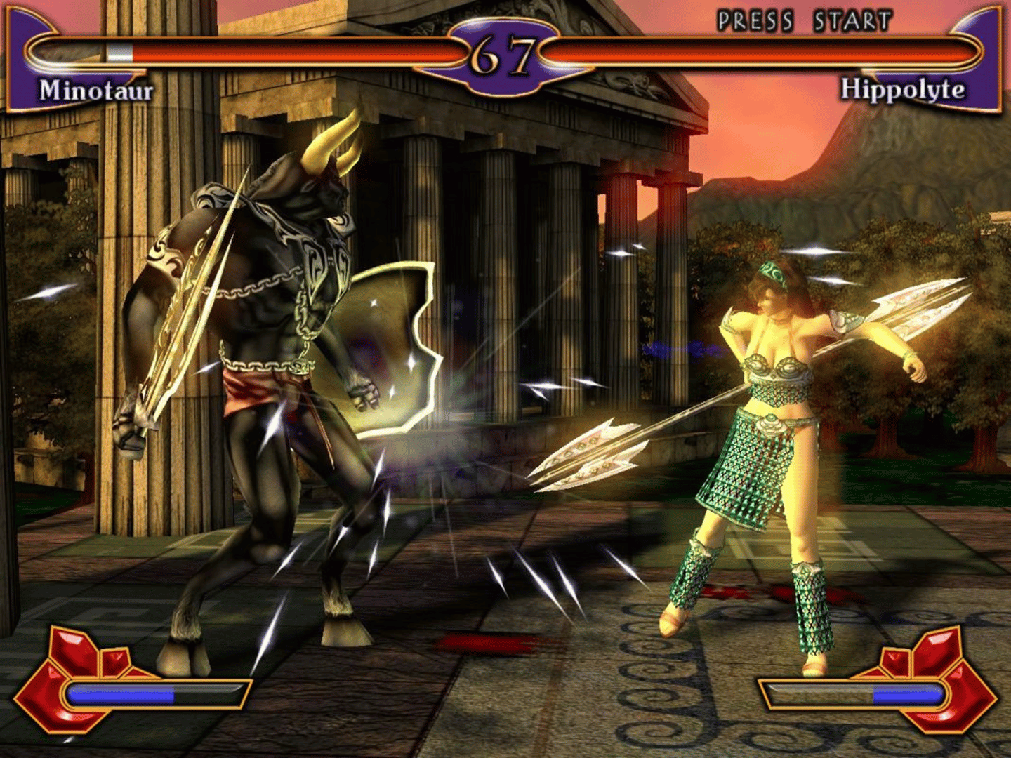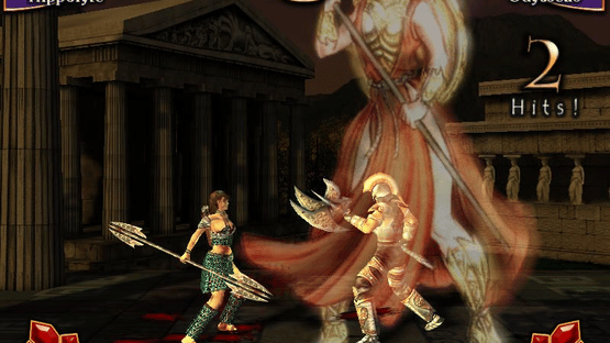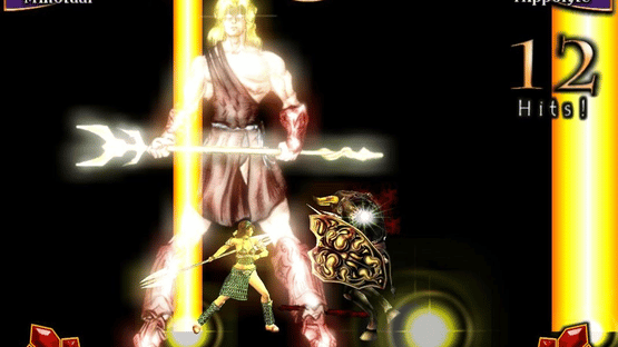 Mythic Blades is a one-against-one fighting game based on Greek mythology. The background story is that Ares challenged Zeus for control over the Olympus and now they use eleven heroes and monsters (e.g. Odysseus or Polyphemus) to battle it out in area fights. The player takes control over one of those fighters, selects one of the four difficulty levels and has to win eight rounds against randomly chosen enemies. This is also the only single-player mode (of course there is also the possibility to fight against another player) and every victory rewards credits. Those can be used to unlock more characters, character biographies and concept art. Regarding gameplay, each fighter has three basic moves (can be combined for combo attacks), special moves ( performed by pressing the correct button combination) and an especially powerful, unblockable divine power, e.g. Perseus can summon Zeus.