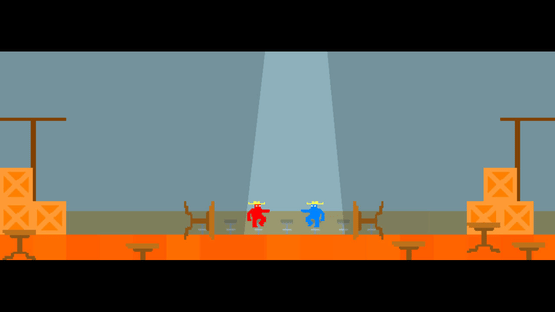 Cowboyana tells the tales of Billy Blue and Rufus Red as cowboys in the Wild West. They spend their days drinking, getting into fights and duels, sleeping, and running around on top of trains. The game requires two players to play at the same time. The game randomly loads any of the available sequences in a loop with no ending. After each sequence, a short impression in shown in text. In the drinking game, players both control the same bottle as they try to down as many drinks as possible. They can hinder each other and generally spill half the bottle on the table. At any point during the drinking, they can decide to draw their guns and start a duel. In other sequences, they either fight alone or together, in the desert or on trains. The characters can move around, jump, shoot and reload.