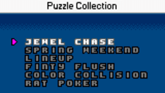 A Game Boy version of the Windows puzzle suite of the same name, featuring 6 of the 10 games released on PC, designed by Alexey Pajitnov, the original Tetris designer, on one Gameboy Color cartridge. Jewel Chase. A level based game. Every level consists of a labyrinth of colored pathways, scattered valuables, locked doors, keys, a thief (the player), on some levels an opposing thief and a door marked exit. The goal is to reach the exit to proceed to the next level, valuables can be 'stolen' for score. If the opposing (computer controlled) thief reaches the exit before the player, the game is lost. Movement is not possible between differently colored tiles, unless a special, multicolor 'bridge' stone is used. 99 levels total. Spring weekend. A rotation puzzle, where a given pattern needs to be recreated by rotating elements on the playfield. Lineup. Using 'Tetris' style blocks, a continuous line from a screen border to an opposite screen border needs to be build. Elements appear on an element stack, and can be selected freely from that and subsequently placed anywhere on screen, without overlapping each other. If the element stack is full, the game is over. As soon as a line is complete, the elements of that line are removed from the screen. Elements appear faster over time. Finty Flush. A grid on top of the screen fills slowly with multicolor balls. The player can pick one out of 4 squares on the bottom of the screen to shift balls in one line into and out of these squares. The squares can be rotated in 90 degree steps. As soon as any square is completely full with balls of the same color, its content empties to make room for more balls. 3 filled square grids grant a bonus point, and the next level begins (tiles appear faster). The game is over when the upper grid is full. Color Collision. A 'Qix' style ray ( no better way to describe this - for the younger audience - imagine a flapping fan ) moves with increasing speed through a screen full of obstacles. The player can only indirectly control it - any time the direction pad is pressed, it gets 'reflected' into the direction that has been indicated. Objective is to hit obstacles with a given color and pattern, avoiding all other elements. To top things of, the patterns change over time. The game ends if the wrong obstacles have been hit too many times. Rat Poker. Little differently colored rats are automatically fed into labyrinths, with labyrinth design changing and getting more complex during level progression. Switches allow rerouting of the rats to arrange certain color combinations ('hands') of rats. If a given combination is achieved, the contributing rats exit the playfield through a door. You progress to the next level if a given number of rats has been removed from the game. The game ends if there is no space left on the playfield for additional rats. .