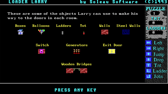 Larry Lontrose is a part-time dock loader. He is very ambitious and wants to be promoted up the corporate ladder. By solving the 40 mind-bending puzzle rooms, you can help Larry fulfill his dreams. Each room has objects like boxes, balloons, TNT and much more! Use these objects and avoid others, to reach the door in each room to complete a level.