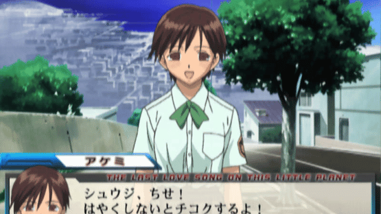 A multi-story, multi-ending love adventure game based on Shin Takahashi's original manga. The player becomes the main character, Shuji, and experiences the last love on earth with the ultimate weapon, Chise. The purpose of the game is to keep Chise in a happy state and continue to fall in love with her until the last day on earth. Depending on the player's choices and actions, "Chise"'s "happiness value" changes, and "Chise" becomes an existence more than "she" or more than "weapon".