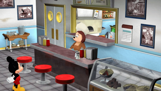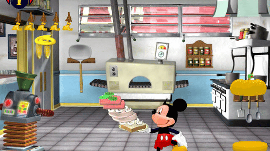 Mickey Saves the Day is an adventure game, with 3D characters against 2D-rendered backgrounds, for children. Players can choose to be Mickey or Minnie Mouse and many Disney characters make an appearance, such as Goofy, Donald and Daisy Duck, Pluto and Ludwig von Drake. The game is entirely mouse-controlled and the cursor changes when an object can be interacted with. It can either be used or picked up to be stored in an inventory, shown as Mickey's hat at the bottom of the screen. Puzzles are solved by talking to other characters or through items. All visited locations are added to map to move around town.