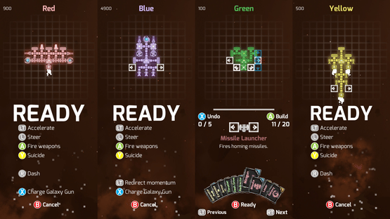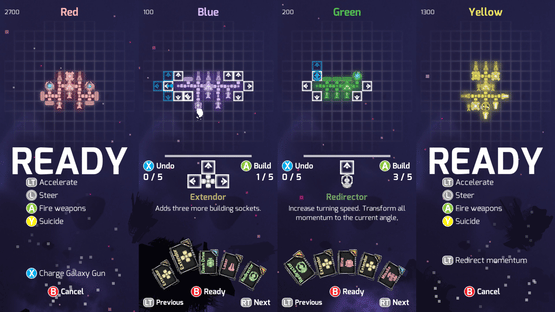 Scrap Galaxy is a local build-and-destroy deathmatch game for up to 4 players. It is a 2D top-down shooter taking place out in space in a galactic junkyard. In this setting, the players are trying to survive by constructing space ships. The game is round-based and each round is divided up into two phases: build phase and battle phase. During the build phase, each player gets a number of components and has to assemble a spaceship from them within a certain time limit. During the battle phase, the players pilot the ships. They battle against the other or team up against the garbage drones living in the junkyard. The randomness and unpredictable nature of the game makes every round into a new challenge, because you always have a new ship to battle with, raising the stakes and making the game quite addictive.
