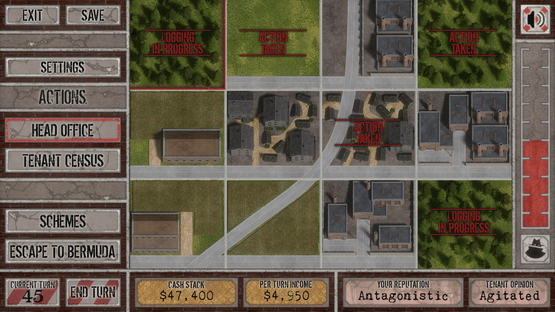 Slumlord Simulator is a turn-based strategy game with a twist of dark humor where your choices matter. In Slumlord Simulator you play the bad guy, the slumlord who builds his fortune on the backs of his tenants with the ultimate goal of escaping to Bermuda with his fortune.