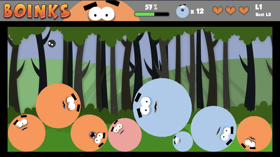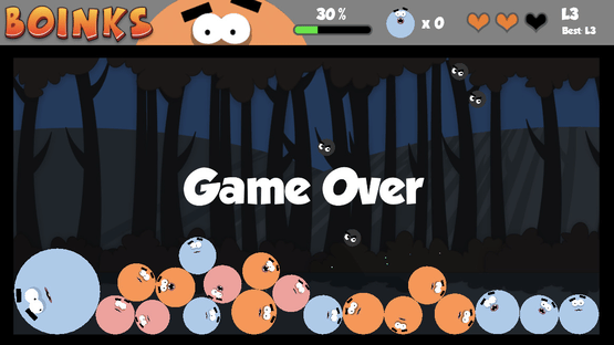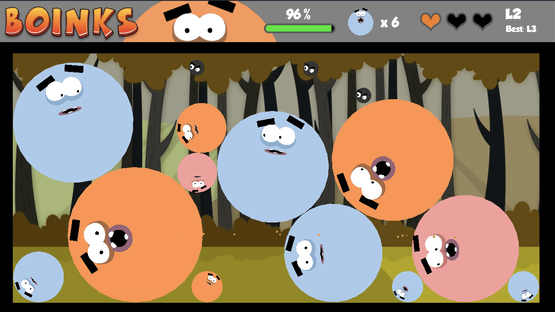 Populate the screen with the happy Boinks. Avoid the nasty bouncies. Fill enough of the screen to progress to the next level. Use your mouse to inflate the Boinks and remember to drop them before they are hit by any nasties, or you'll have to start again. Watch out for the timer and you have a limited number of Boinks per level so make the most of them.