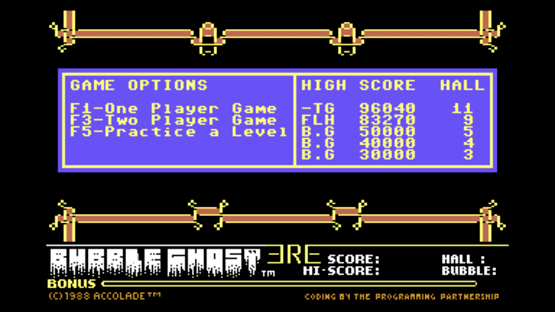 The crazy inventor Heinrich Von Schinker is dead. Or so we thought until the nightwatchman told us his fantastic tale of the haunting of Von Schtinker's old castle. Yes it has been confirmed. Heinrichs' sprit (a.k.a. Bubble Ghost) has been blowing a bubble throughout the macarbe halls of his ancestral home. Your job is to help Bubble Ghost move the bubble through the 35 rooms of the castle, past all the mad inventions of Von Schtinker. Once the little ghostie makes it through, the haunting will cease.