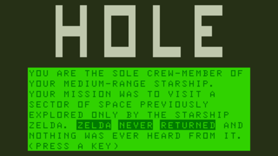 Hole is a text adventure for the Dragon 32/64. The year is 2208, and the player is the sole crew member of a medium-range starship. Their mission is to visit a sector of space previously explored only by the starship Zelda. As the player enters the sector, they find themselves losing consiousness. The player now wakes up in some strange galaxy interlinked by a series of black holes. The player can travel to a series of different worlds useing their ship's navigation system. Each system has unique environmental conditions that require wearing specific suits. There is a save and restore feature. All commands are via VERB NOUN entry.