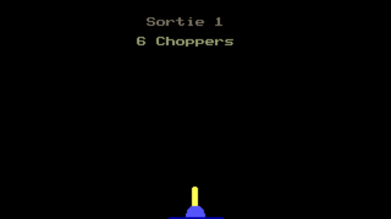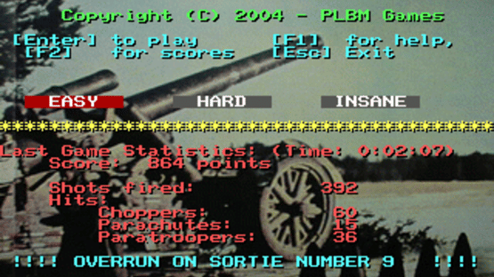 The object of the game is to destroy as many helicopters and paratroopers as possible. If a paratrooper lands on the ground he may still be hit by flying debris, another paratrooper free- falling on top of him or by your gravity-bound shells. There are three levels of play: Easy, Hard, and Insane. You may select the level of play before the game starts. The game also keeps track of your statistics, how many shots fired, how many hits, how many choppers and troops hit, etc. Keep in mind that you have until the START of the next sortie to try and kill the troops on the ground, using the gravity-bound shells or dropping burning wreckage on them. When the next sortie starts, if there are more than four (4) troops landed on either side of your base the game will end and your gun emplacement will be BLOWN UP!
