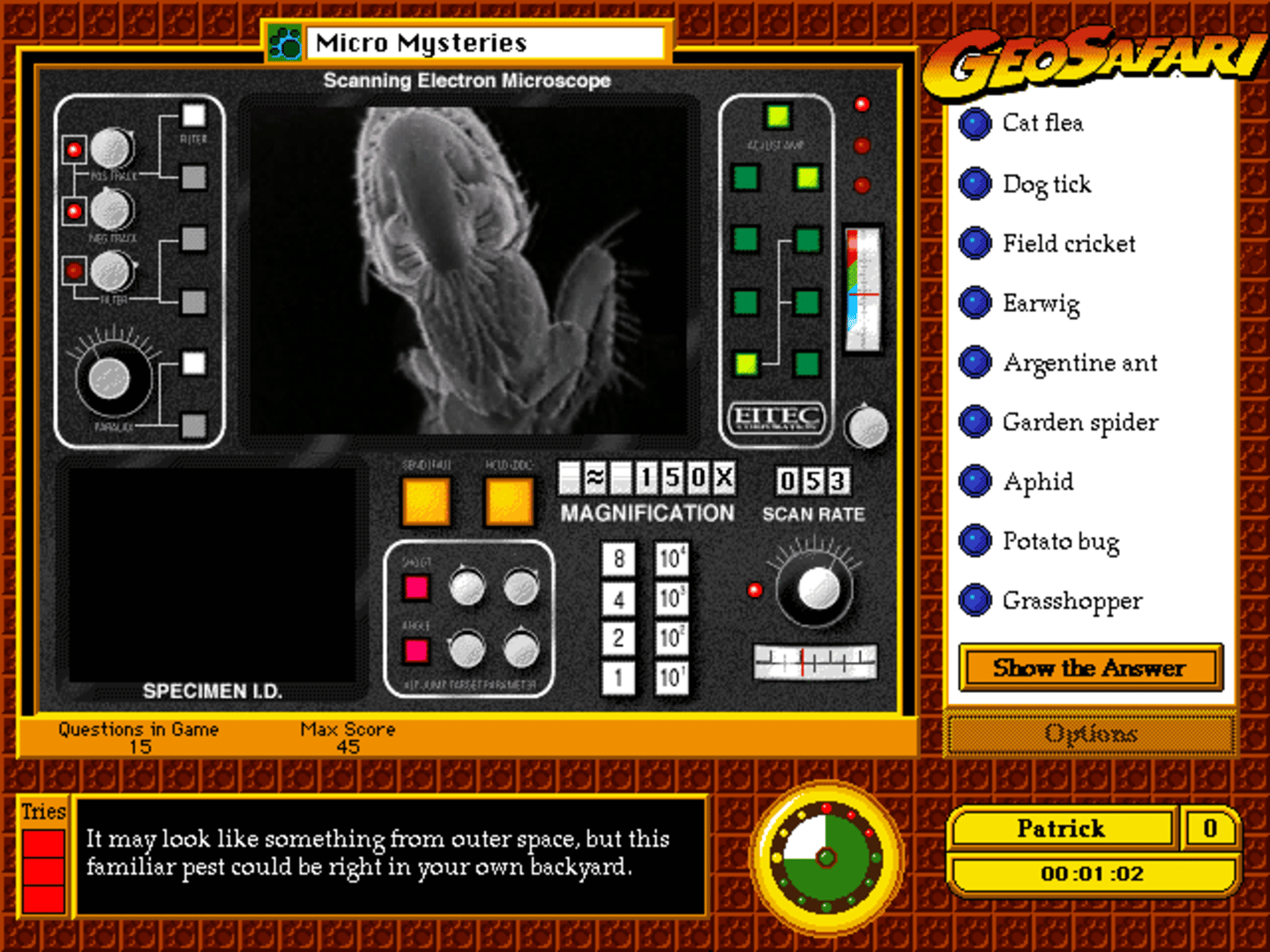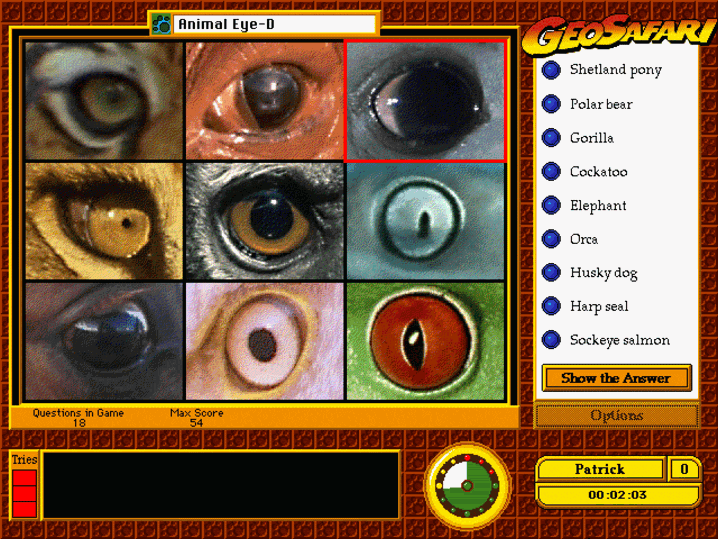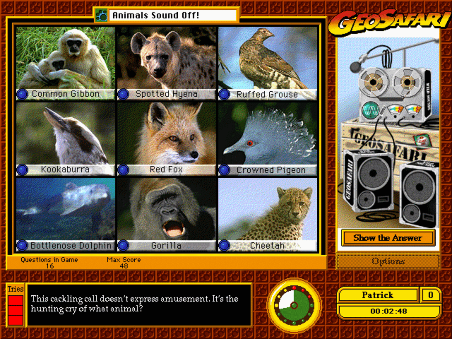 Geosafari: Animals is an educational game about animals for ages 8 and up. There are sixteen games available: Animal Hall of Fame, Shark!, Animals Sound Off!, Geosafari Dog Show, Skulls, Name that Bird Call, Reptiles, Micro Mysteries, Horse Round-Up, Endangered Animals, Animal Art Gallery, Whale Watch, Animal Eye-D, Weird World of Animals and GeoChallenge. There are pictures, illustrations and even videos.