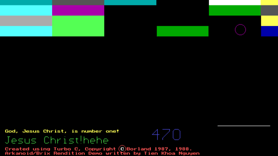 ArkanDOS is a game inspired by the original Arkanoid and Brix. It is written in Borland Turbo C 2.01. Includes source code and a native Windows port.