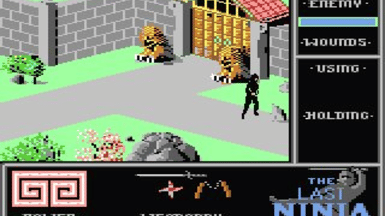 Brotherhood. Survival. Revenge. The evil Shogun Kunitoki and his henchmen have slaughtered the entire Brotherhood of White Ninja. You alone survive. The Shogun has taken possession of the Ninja Palace of Lin Fen and the sacred scrolls containing the ancient secrets of the Ninja. Only you- the Last Ninja- can avenge the Brotherhood and recapture the secrets of the Ninja. You must use all your fighting skills. Samurai warriors, masters of the martial arts, and the Shogun's guards lurk at every turn, ready to test their hand-to-hand combat skills against yours. You must be as wise as you are strong. Find your way through a magnificent landscape that unfolds in screen after screen of unparalleled graphics- from the lavish interior of the Ninja Palace to the depths of its foulest dungeons. Scale forbidding mountains; cross lakes and rivers. Master new and dangerous tasks, like Ninja magic. Search for the hidden weapons, food, and charms that you need to win the final battle- and all the battles in between. The way is long and dangerous. Start now. Kunitoki's warriors are already learning the Ninja ways.