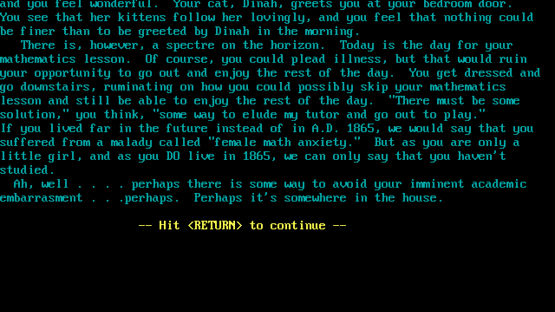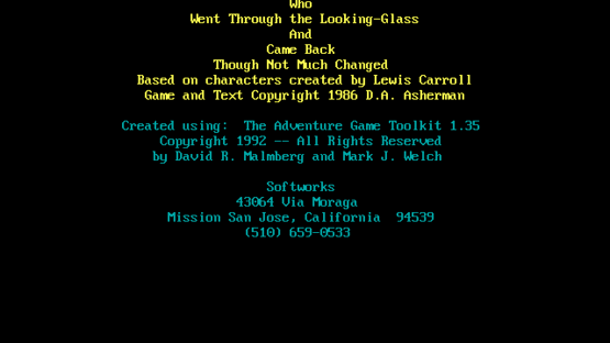 The Adventures of Alice who Went Through the Looking-Glass and Came Back Though Not Much Changed is a video game published in 1986 on DOS. It's an adventure game, set in an interactive fiction theme.