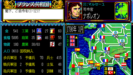 L'Empereur is a turn-based strategy video game for the Nintendo Entertainment System released by the Koei company in 1989. The user controls Napoleon Bonaparte during the Napoleonic Wars of the late 18th and early 19th Centuries. The goal is to conquer Europe. The game begins with Napoleon as an army officer, but with victories in combat, the user may get promoted to Commander-in-Chief, First Consul, and finally Emperor of the French, with more powers and actions available at each level. As Emperor, the user also controls Napoleon's brothers, Louis, Jérôme, Lucien, and Joseph, as well as Napoleon's stepson, Eugene Beauharnais. The game has both military and civilian aspects. The user can lead armies, act as mayor of cities, and depending on the level achieved, engage in diplomacy with other nations. This historically accurate game reproduces many historical figures and the militaries of Europe with great detail.
