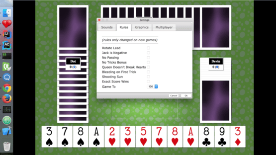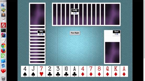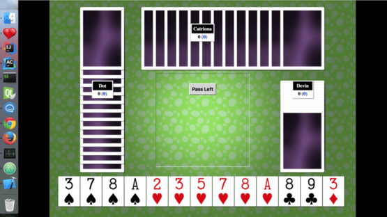 Hearts is a great family card game for kids to adults. It's a tricking taking game involving 4 players, where the object of the game is have the lowest score when one person gets more than 100 points. The game starts by dealing 13 cards to each player. Each player passes cards, then plays in sequence, with the objective being to avoid all the hearts and especially the Queen of Spades! Features: * 9 rule customizations * 3 decks * 16 backgrounds * 8 statistics
