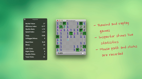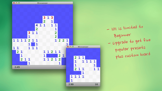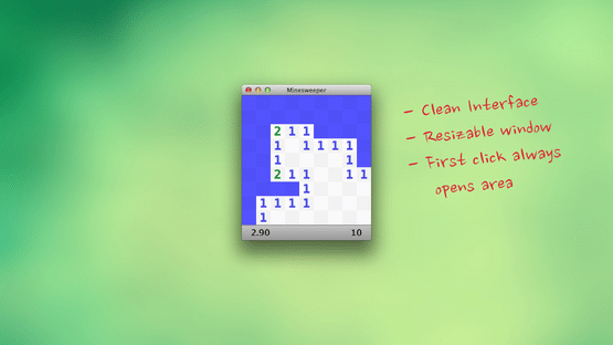 Minesweeper, a refreshingly clean, yet authentic interpretation of the classic strategy/puzzle game. The object of the game is to identify all mine squares by revealing all non-mine squares. The best minesweeper experience available. FEATURES - Beginner size preset (upgrade to the full version for five popular presets and custom) - Save, load, and replay games. - Mouse path is tracked with replay, and can be displayed. - Window can be resized at any time - Area is always opened on the first click. - Double-click or press both buttons to reveal adjacent squares. - A Right-click anywhere after a game, or click the clock to start a new game. - Best times are tracked in a high score table. - Chording is available for faster play. - The Inspector tool shows live game statistics. - Colors can be changed. NOTICE A mouse with two separate buttons is ideal for this game. If you use a trackpad or magic mouse, be sure to enable secondary clicks in your system preferences.