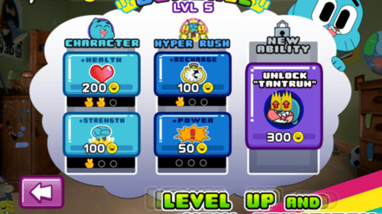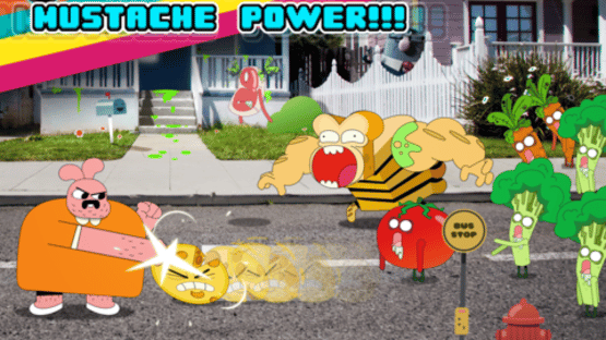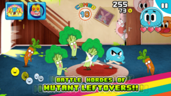 Mutant Fridge Mayhem is an action game set in The Amazing World of Gumball universe where players battle mutated food across 30 levels. Players can switch between three playable characters - Gumball, Darwin, and Anais - each with unique abilities to combat the infected leftovers threatening Elmore. The game features character power-ups, including mustache transformations and tennis ball cannons, as players work to contain the mutation outbreak caused by spoiled jelly in the Watterson family refrigerator.