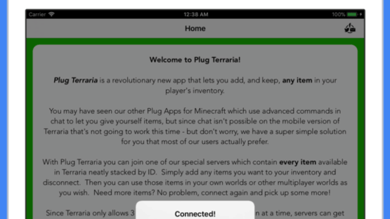 Plug Terraria is a revolutionary new app that lets you add (and keep) any item in your player's inventory. The first app to let you add items to your own inventory in Terarria for iOS. This is not a guide app, or one that only works on the PC version, Plug Terraria will really let you get any item you like for Terraria on iOS, and keep it forever. Now you can get any item in Terraria and use it in your own worlds or any multiplayer worlds. Need more items? No problem, open the app and get some more! There's no extra charges or in app purchases, you can really get as many items as you like forever! Another world first in the Plug series of apps - we've been bringing you commands, inventory add ons and mods in the Minecraft world for years, now it's time for something amazing for Terraria :). Be sure to check out our developer page to see our other apps in case you missed them. Disclaimer – This is a third party App, it is not the game Terraria or Minecraft and is not affiliated with the game, or its creators in any way.