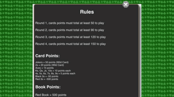 You can now play the challenging card game Hand and Foot on your mobile device! Hand and Foot is compelling card game where each player is dealt two decks of cards: one 'hand' and one 'foot'. The object of the game is to build melds of cards to form 'books' which are groups of seven or more cards, score as many points as possible, and play all of the cards in your hand and foot decks as quickly as possible. The best Hand and Foot players are those who can accumulate large point totals and quickly go out which traps the other players with cards in their hands and thus leaves them with negative points. If you enjoy card games such as Canasta, Gin Rummy, or Hearts, than you will absolutely be blown away by the uniquely challenging Hand and Foot! After a practice round or two, a new player can quickly learn the rules and enjoy this extremely addictive game! FEATURES: - 1, 2, or 3 Virtual Opponents - 3 Difficulty Levels - 10 Background Options - 24 Different Player Icons - High Score Tracking - iPod Music Play - Horizontal or Vertical Play - Detailed Rules, Strategies, and Help Pages If you are a Hand and Foot enthusiast, you know how long it takes to shuffle multiple decks of cards and tally scores when you physically play the game. You will love the speed at which you can play with our app!
