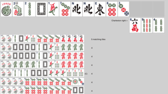 Real American MahJong with Charleston. Not a tile matching game. American MahJong Practice 2017 is a great way to learn new scorecards, practice quick hands or play for fun. Test game strategy with replay option. For beginners, reference Standard American MahJong rules online. Use patterns from any league scorecard or your own. Patterns are not validated. A game ends when you mahjong or the tiles run out.