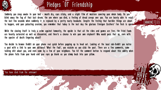 After waking from a terrifying dream of your own untimely death, you attempt to make your way to the Finnigan Brothers' Fun Park for its last day then back home again. It's like playing Russian roulette with five chambers loaded, but more frustrating.