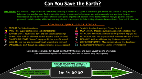 Your mission is simple. Billions on earth depend on you to save them from thousands of asteroids endangering their lives! Use your skills to control a space ship with real inertia and use a variety of exciting power-ups and attacks to give you the best chance possible at saving our home planet!