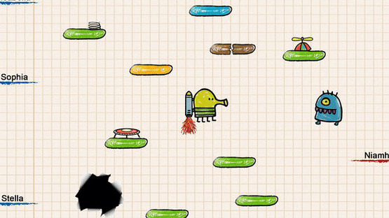 BE WARNED: Insanely addictive!  "possibly the best iPhone game ever created" - Touch Arcade  From prime-time sitcoms (BIG BANG THEORY) to late night TV (JIMMY FALLON) to a fashion accessory for pop stars (LADY GAGA), Doodle Jump is EVERYWHERE! It's a cultural craze, a hot new trend!  The iPad version brings you all that you love in the original iPhone game with brilliantly rendered full screen iPad graphics, lush environments, and AWESOME iPad-only features including a special multiplayer racetrack theme! ********************************************* In Doodle Jump, you guide Doodle the Doodler—using some of the most subtle and accurate tilt controls in existence—on a springy journey up, up, up a sheet of graph paper, picking up jet packs, avoiding black holes, and blasting baddies with nose balls along the way. Laugh with delight as Doodle™ blows past other players' actual score markers scribbled in the margins. And be warned: this game is insanely addictive. FEATURES: - 12 incredible worlds + SECRET easter eggs - broken, moving, disappearing, moveable, shifting, and EXPLODING platforms - JET PACKs, PROPELLER HATS, ROCKETS, and springs that fly you higher - UFOs, black holes, monsters, bear traps! - jump on monsters to bring them down MARIO-style - share your scores r - race agains friends! - global leaderboards, achievements! How to play: Tilt to move left or right, tap the screen to shoot. ______________________________________________________________________ * BE WARNED: This game is INSANELY addictive! * Don't doodle jump and drive!