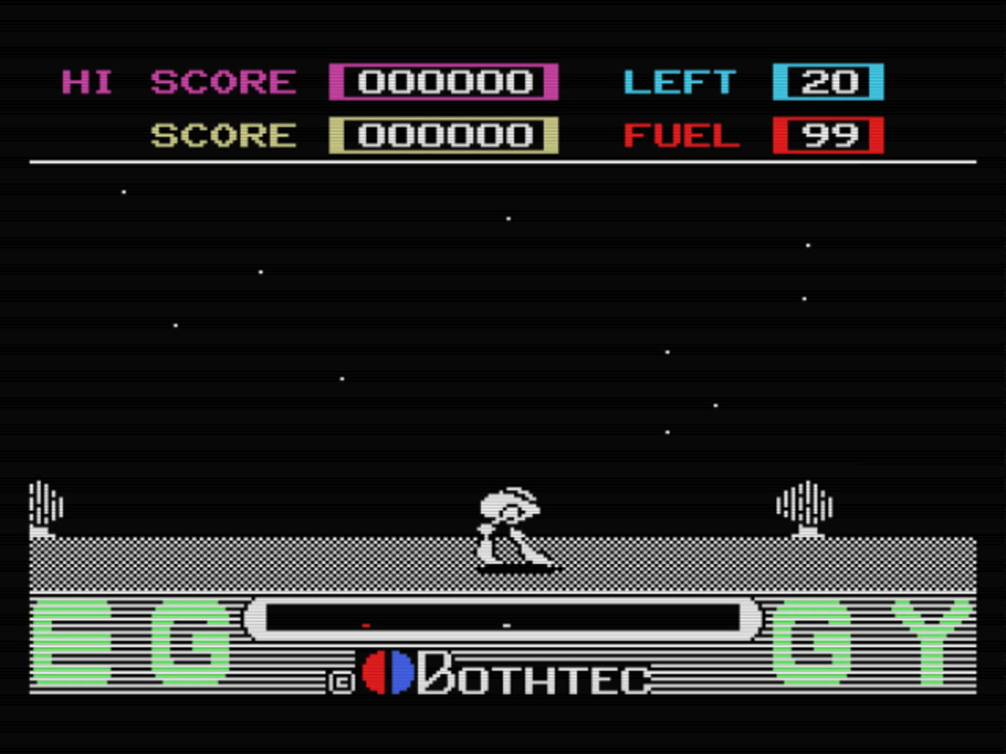 EGGY is an action game that won the Excellence Award at Bothtec's first programming contest and was inspired by Choplifter. In this game players take the role of Ena, a robot which has to collect goods that are dropped from the sky with parachutes. The robot has a limited fuel supply that decreases with time and every time the robot takes damage from the enemies. The fuel supply can be replenished by saving humans that were transformed into killer cyborgs. The robot can only shoot diagonally after jumping and the location of the enemies, as well as the goods are indicated on a small map in the bottom. To complete each level, players need to collect a set amount of goods indicated at the top-right part of the screen.