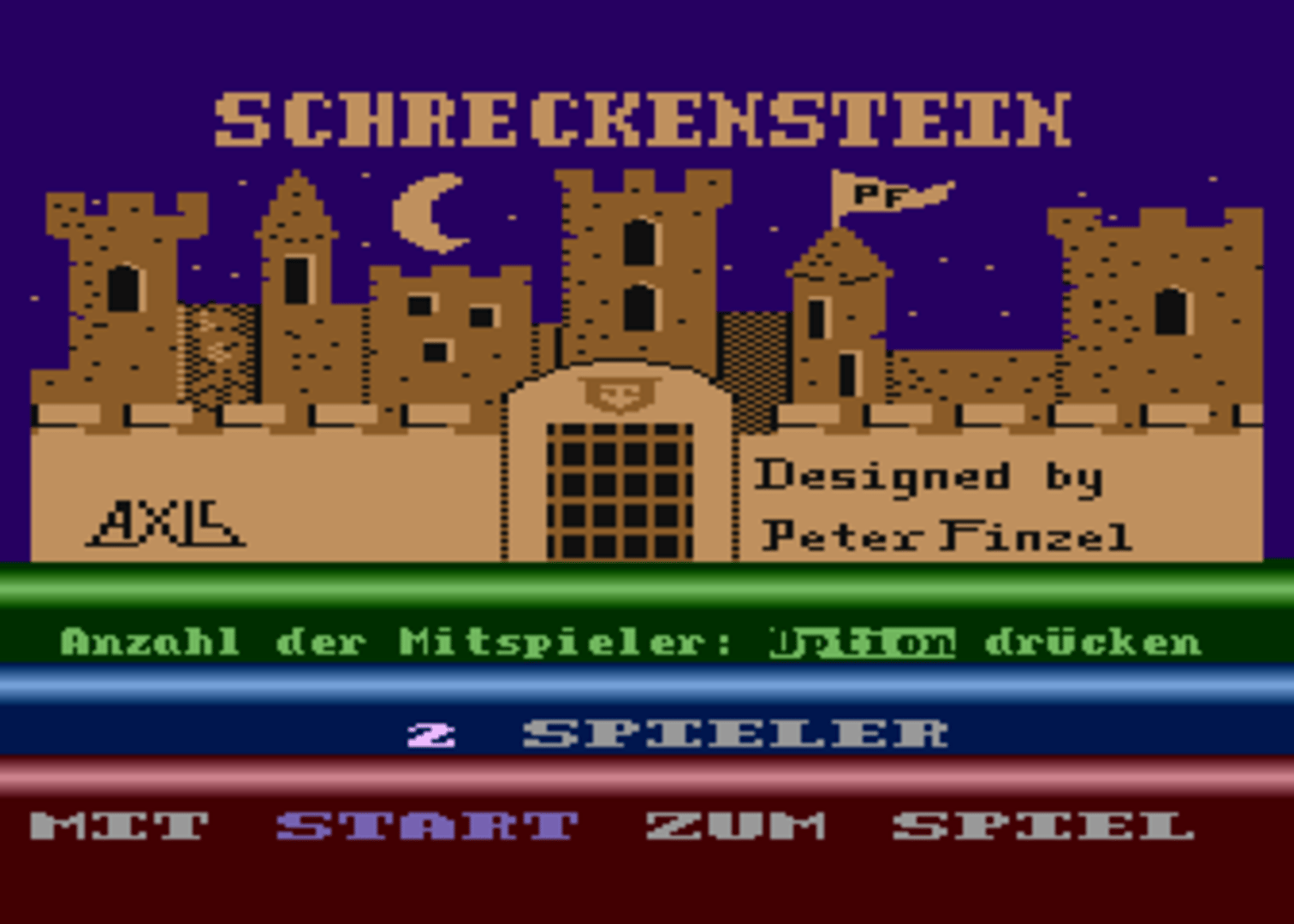Schreckenstein is a platform maze game designed to be played by two players, with each player's surroundings shown in either the top or bottom half of the screen. If a single player is selected, the computer operates the second player. In each level, the players must traverse the maze collecting health elixirs and level specific objects while avoiding spooks, bats, spiders and miscellaneous traps. Each player can throw a weapon to dispatch their enemies. On each level, the collected objects are either used to activate sites or give them to a white sorcerer for use. When enough have been collected, a key appears somewhere, and once collected this allows the door to the next level to be opened. For the first level, the players collect torches and use them to activate giant skulls. On the second level, gems are collected for the white sorcerer, who appears randomly and infrequently as a ghostly apparition. On the third level, tokens must be deposited into magical wells. On the fourth level, the player must again collect crystals, but they are enchanted, and cannot be picked up unless the player is first given the ability by a white sorcerer. In the final level, the players must find magic eyes for the white sorcerer. Each player has a health meter, which trickles down with time or drops after contact with a monster. Once the energy reaches zero, the player dies. If this happens to the computer or in two player mode, the first player to die eventually re-animates as an undead creature who pursues the other player. If the living player completes a level, their companion is given extra energy and returned to life with a small amount of energy for the next level.