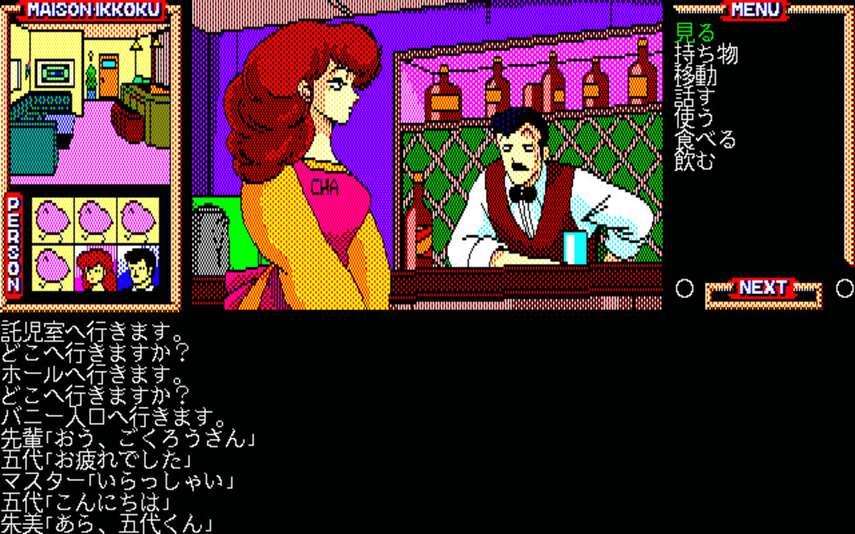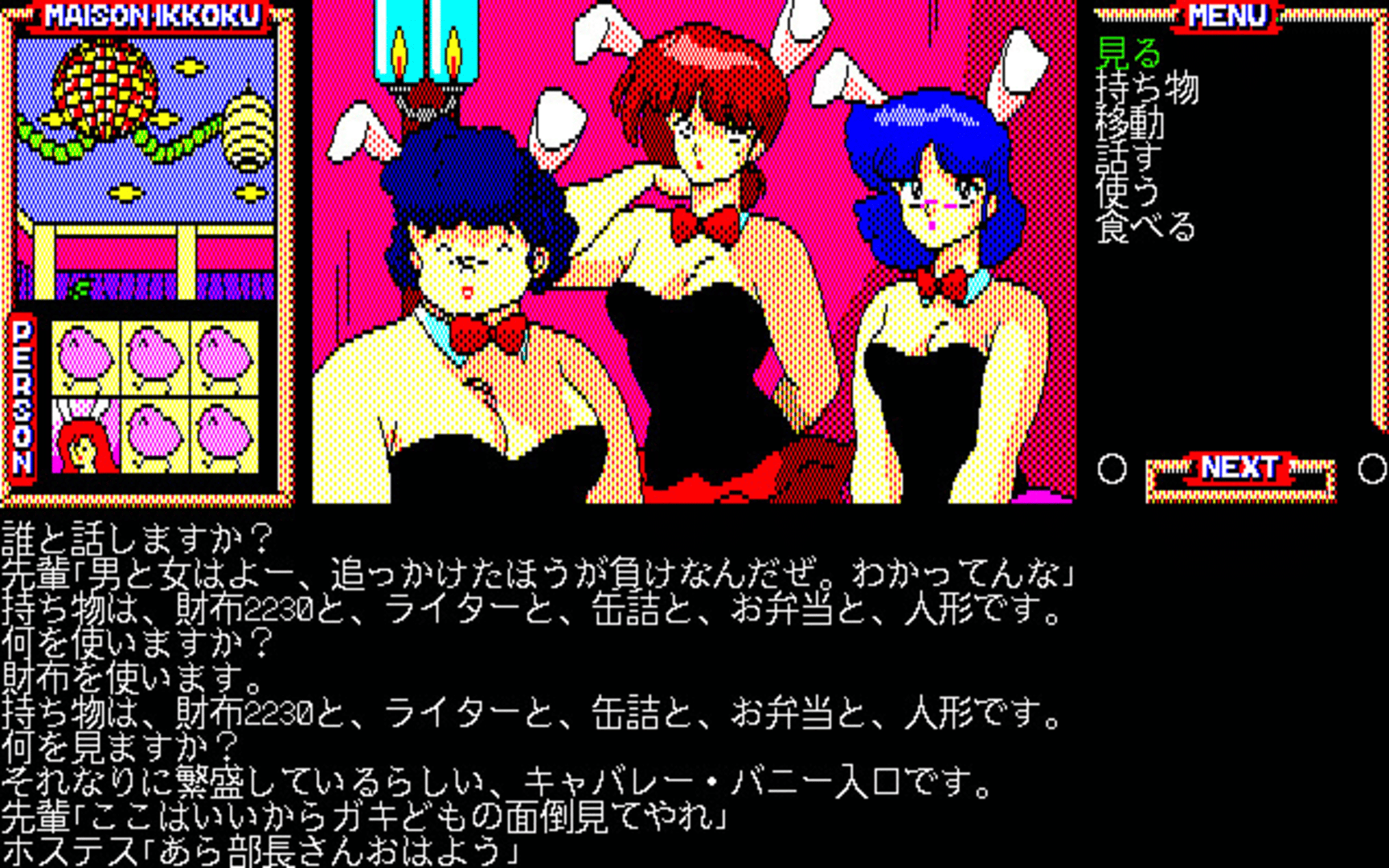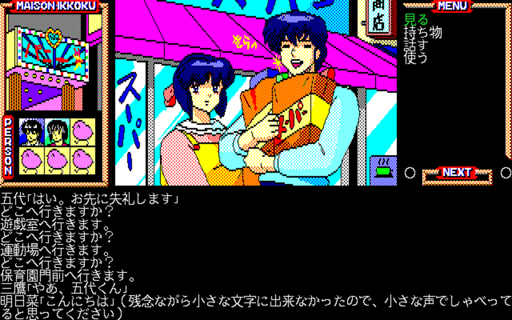 The game is based on the manga Maison Ikkoku by Rumiko Takahashi. The game is a "puzzle-less" adventure, the gameplay mostly focusing on simply depleting all the verb commands at every given screen and moving between locations. The commands include the usual "Look", "Talk", and Move" typical for Japanese adventures (no "Think" command), but also context-sensitive commands "Eat", "Drink", etc., as well as the possibility to use certain inventory items.