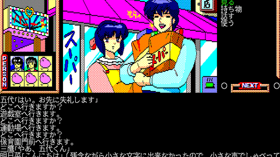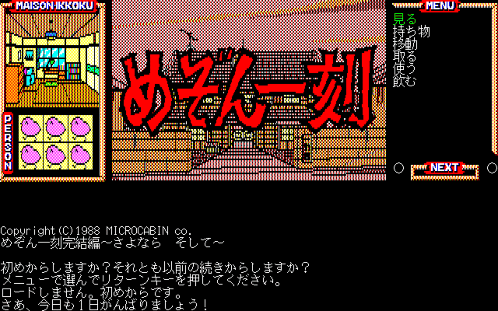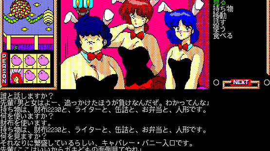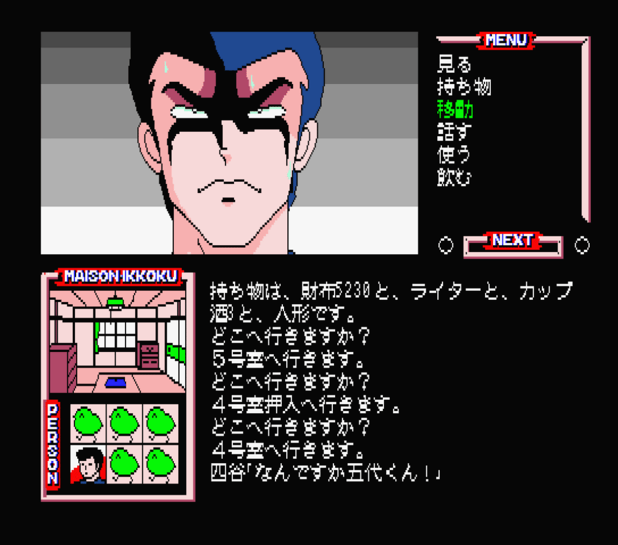 The game is based on the manga Maison Ikkoku by Rumiko Takahashi. The game is a "puzzle-less" adventure, the gameplay mostly focusing on simply depleting all the verb commands at every given screen and moving between locations. The commands include the usual "Look", "Talk", and Move" typical for Japanese adventures (no "Think" command), but also context-sensitive commands "Eat", "Drink", etc., as well as the possibility to use certain inventory items.