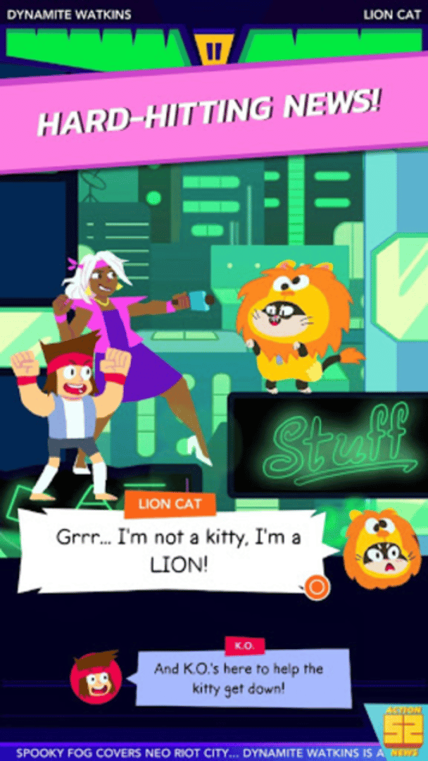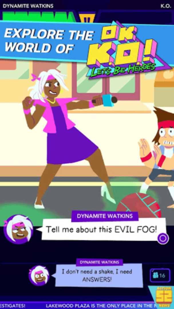 Dynamite's Action News is a mobile game in the OK K.O.! Let's Be Heroes franchise. It was developed by Wake Robin Games, a three-person studio in Portland, OR, who beat out 200 independent developers to win a fully-funded contract. With the initial game concepts completed in just under 48 hours, the game won Cartoon Network's first ever Game Jam at Pax East 2017. It has been taken off the App Store in 2020 and can no longer be downloaded, alongside any other OK K.O. focused app games.