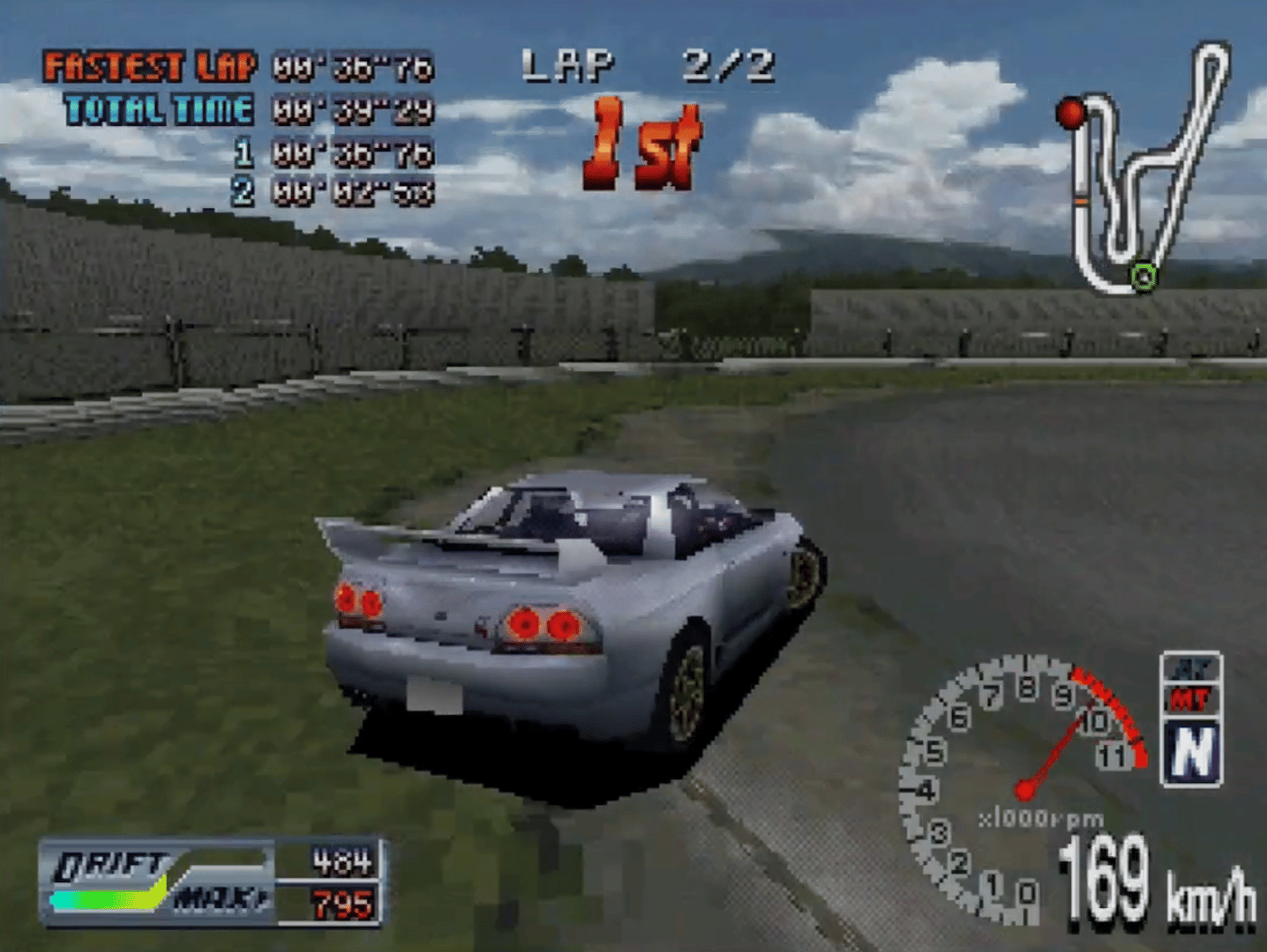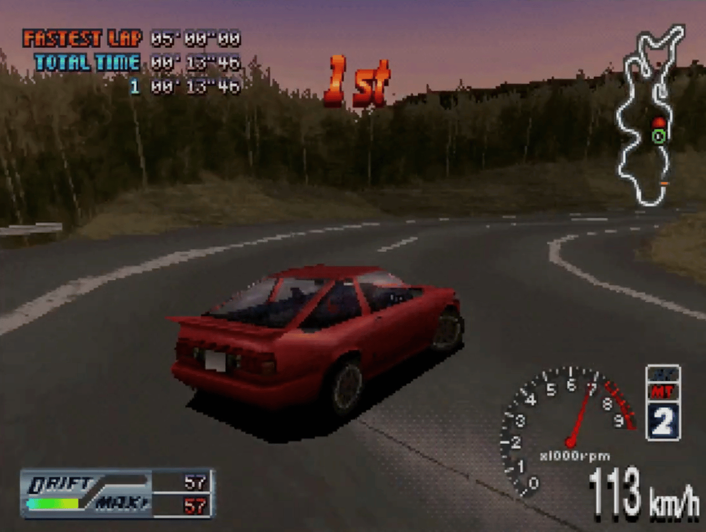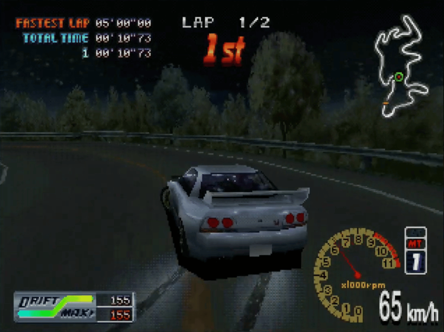 A touge-focused drifting racer where players compete one-on-one on narrow mountain passes with realistic handling and an expanded car roster. Modes include King Battle, Time Attack, Story, Gymkhana, and two-player versus, with night courses and customization options emphasizing racing line and drift technique.