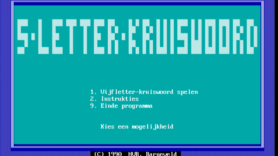 5-Letter-Kruiswoord (5-letter-crossword in English) is a game in which the player solves a crossword that consists of only 5 letter words. The player can at any time check whether the answers he/she has given are correct. For every letter that is not filled in, the player gets 1 point. For every letter that is filled in wrong, the player gets 3 points. When the player does not know an answer, they can ask the computer for the right answer, but she will get 25 points. The objective of the game is to fill in the whole crossword with the right answers and get as few points as possible.