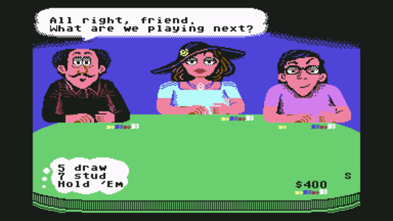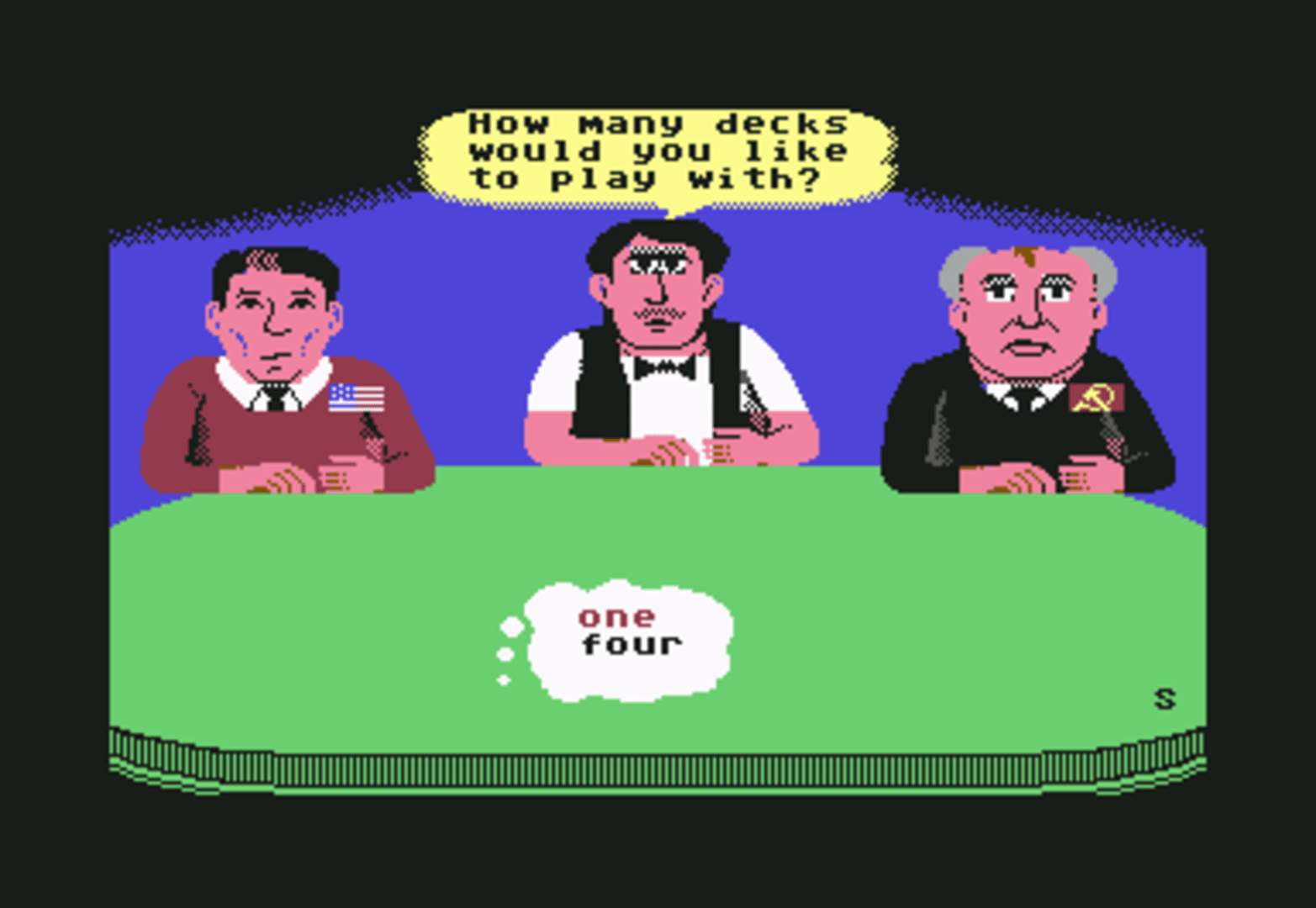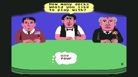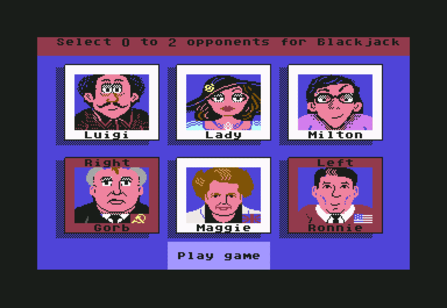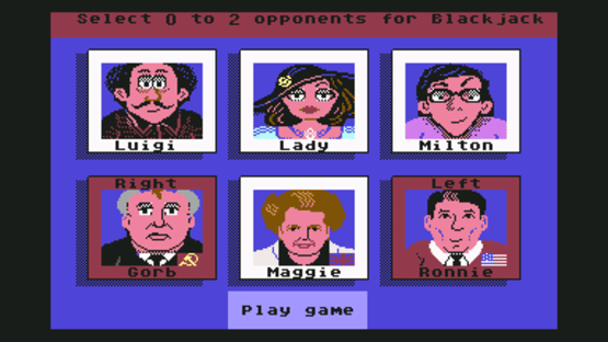 Card Shark is a a game about playing cards where the player can select from three different games: poker, hearts and blackjack. Poker is additionally divided into five card draw poker, seven stud poker and hold'em poker. He can play as up to three players from six available opponents featuring such characters as Michail Gorbachev, Ronald Reagan and Margret Thatcher. The aim is simple: the players start with a set amount of money each and the one who takes all the opponent's money wins.