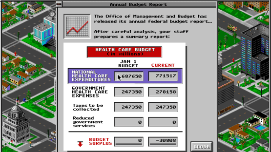 SimHealth has a rather serious subject matter: the debate in the summer of 1994 over what kind of health care system the United States should have. The player gets the usual godlike power, being able to choose what proposals to adopt and even what assumptions should be in the underlying mathematical models (an especially good thing, since many of the models turned out to be so very wrong).