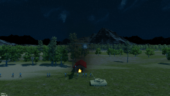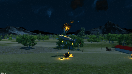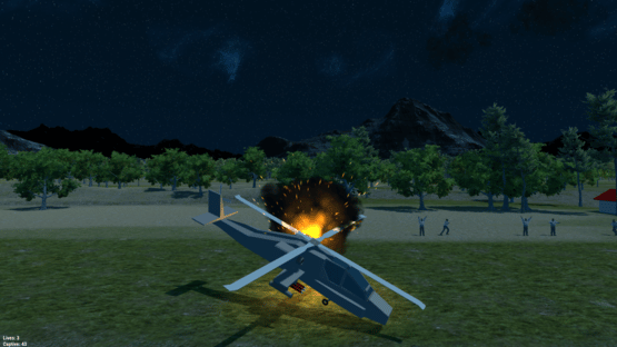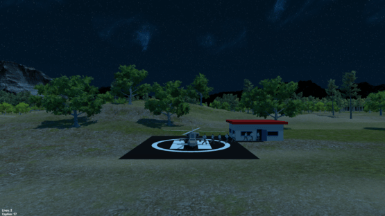 In Nachtmission you play as the pilot of a rescue helicopter. You begin at your base and fly into enemy territory to rescue the prisoners there. When a prison is found, you must shoot a hole in the wall to release the captives. Once you've collected some prisoners, you must fly them back to your base and drop them off. Your helicopter can only hold a limited number of captives at once, so you must make several trips. There are tanks in your way at the start, and as the enemy becomes aware of your efforts, jets and drones appear to add to the difficulty. Prisoners can easily be killed by friendly or enemy fire, or by landing on them. The objective is to rescue as many prisoners as possible while losing as few helicopters as possible. The world is 2.5-dimensional: it is presented in 3D but the player can only move up, down, left, and right. The player can rotate the helicopter in different directions: facing forward, the helicopter shoots straight down, making it easier to hit targets on the ground. Facing left or right, the helicopter shoots in those directions, which is best for hitting airborne targets. The helicopter can fly in any of the four directions independent of which direction it is facing.