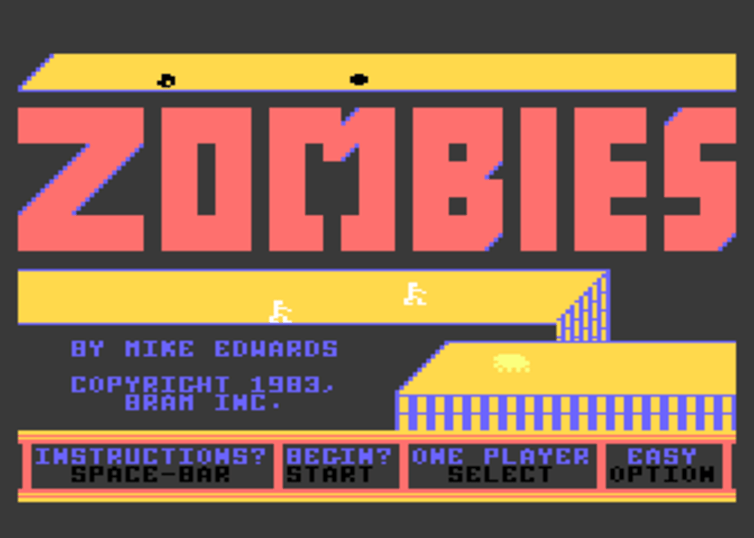 Zombies is a platform game in which the protagonist has to fight the titular monsters, snakes, spiders, and an array of other creatures in order to survive. The game features a total of 13 dungeons with 129 different rooms. A cooperative mode with another player is also included. The game was re-released in 1984 by Electronic Arts but it was renamed to Realm of Impossibility.