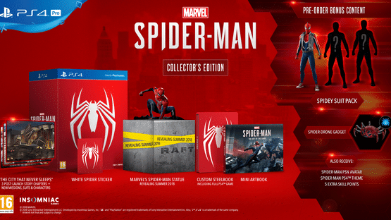 Starring One of the world's most iconic Super heroes, Marvel's spider-man features the acrobatic abilities, Improvisation and web-slinging that the wall-crawler is famous for, while also Introducing elements never-before-seen in a spider-man game. From traversing with Park our and unique environmental interactions, to new combat and blockbuster action, it's spider-man unlike any you've played before. Sony interactive entertainment, insomniac games, and Marvel have teamed up to create a brand-new and authentic spider-man adventure. This isn't the spider-man you've met or ever seen before. This is an experienced peter parker who's more masterful at fighting big crime in new York city. At the same time, he's struggling to balance his chaotic personal life and career while the fate of millions of new yorkers rest upon his shoulders. Collector’s Edition Includes: Full Game. Custom Steelbook. White Spider Sticker. Mini Artbook – Contains unique, early-look concepts and unreleased artwork Collector’s Edition Marvel’s Spider-Man Statue by Gentle Giant. Marvel’s Spider-Man: The City that Never Sleeps - consists of three-post launch story chapters featuring new characters and missions. Users will receive DLC by March 2019. If pre-ordered before September 7, 2017, receive all Pre-Order Bonus Content.