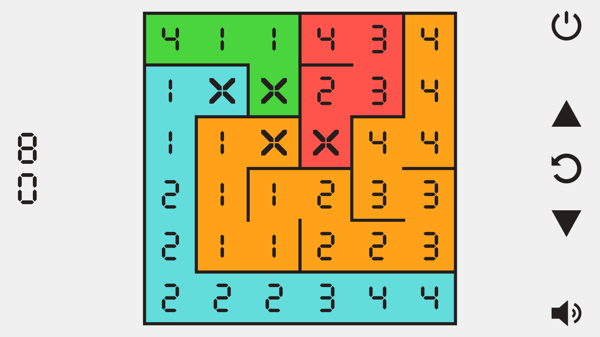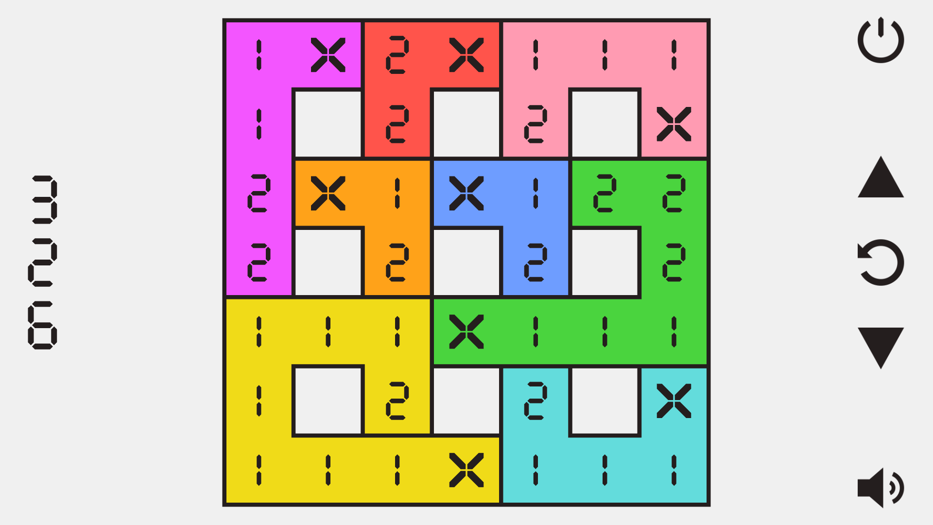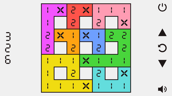Cardinal Chains is a minimalist puzzle game centering on the concept of non-decreasing sequences. Each puzzle begins with a monochrome grid of numbers, plus a few colored cells marked with an X. Starting at these cells, you must link up numbers in non-decreasing order until the whole grid is filled with color.