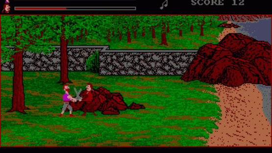 The player takes the role of Maddog Williams who wants to rescue the beautiful Princess Leoria and free her father King Thaylor. He also needs to vanquish the Evil Serak and restore peace to the lands of Duridian. The Adventures of Maddog Williams in the Dungeons of Duridian is primarily an adventure game. Similarly to Sierra adventures, the player directly controls the movements of Maddog and types in text commands to perform an action. As usual he explores his surroundings, collects items and uses them to solve puzzles. There are also a few action-based sequences in the game. If the player meets an enemy the game switches to the fighting view. The combat is in real time and the player controls Maddog's basic movements: side steps, blocking and attacking in two different heights. There are three difficulty levels which mostly influence the combat but the lowest one also results in easier puzzles.